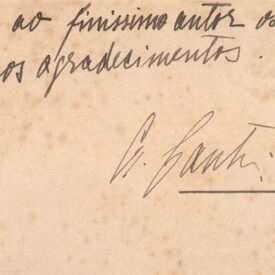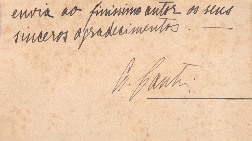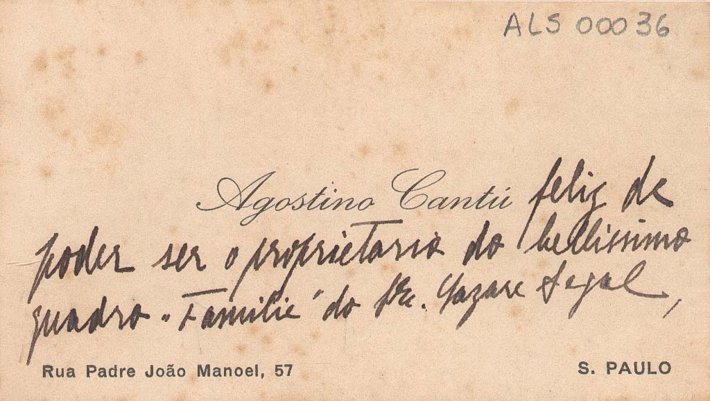Cartão de visita de Agostino Cantú; diz estar feliz por ser o proprietário do "belíssimo quadro Familie do Sr. Lazar Segal"; envia agradecimentos