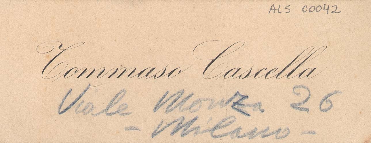 Cartão de visita de Tommaso Cascella; fornece endereço em Milão
