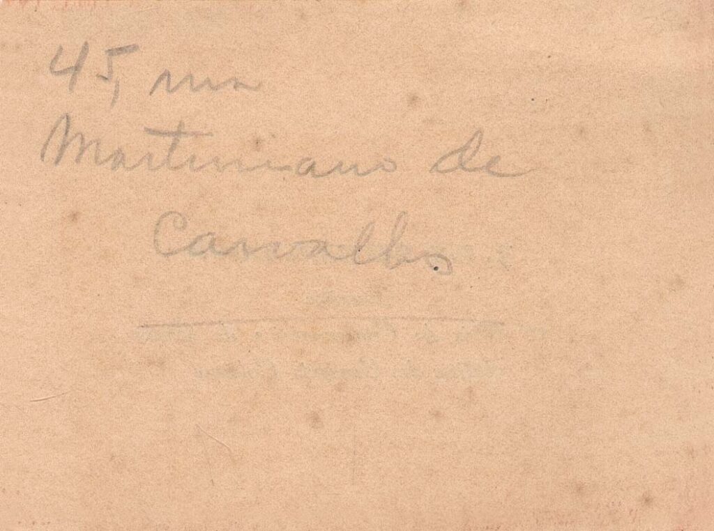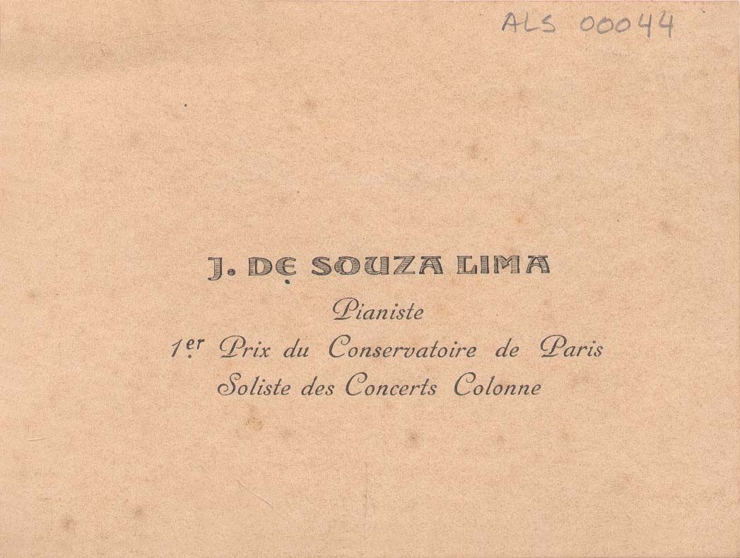Cartão impresso: J. de Souza Lima. Pianiste. 1er Prix du Conservatoire de Paris. Soliste des Concerts Colonne. No verso, a grafite: 45, rua Martiniano de Carvalho