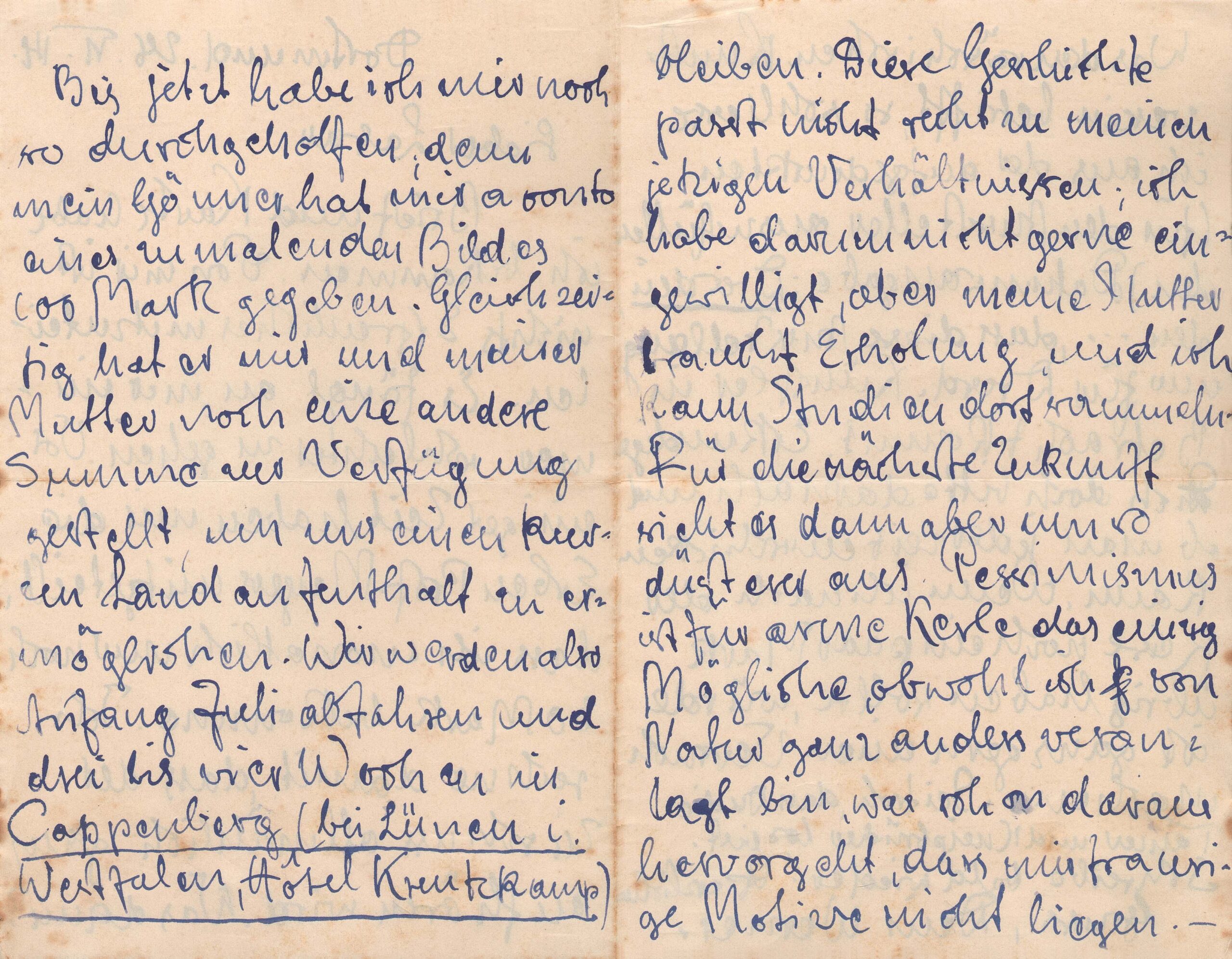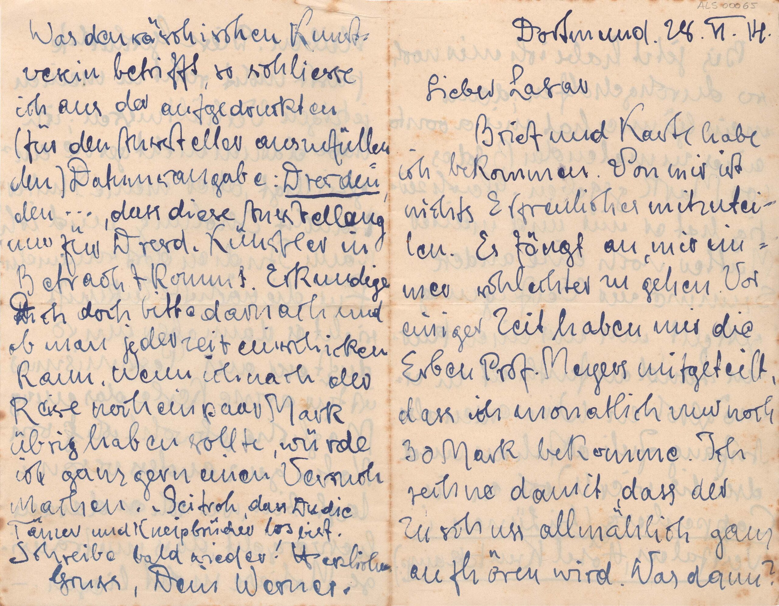 Informa que os herdeiros de seu antigo mecenas, Professor Meyer, diminuíram o valor da mensalidade que lhe era paga, de 40 para 30 marcos, o que o leva a crer que gradualmente deverão deixar de enviar a soma; imagina que sem esse subsídio sua vida tornar-se-á ainda mais difícil; estava temporariamente aliviado de suas dificuldades financeiras porque um financiador havia lhe adiantado cem marcos, como pagamento de uma pintura ainda por fazer, e pusera à disposição de Schultz e sua mãe uma outra soma, que os permitiria passar uma temporada de três ou quatro semanas em Julho em Cappenberg, onde pretendia colecionar estudos para futuras obras. Pede a Lasar que verifique junto à Associação de artes da Saxônia se ali somente artistas de Dresden eram aceitos; caso contrário, assim que conseguisse a soma necessária ao empreendimento, tentaria levar suas obras