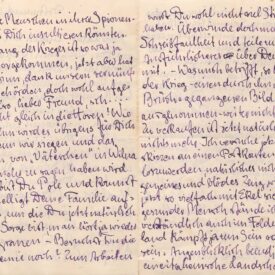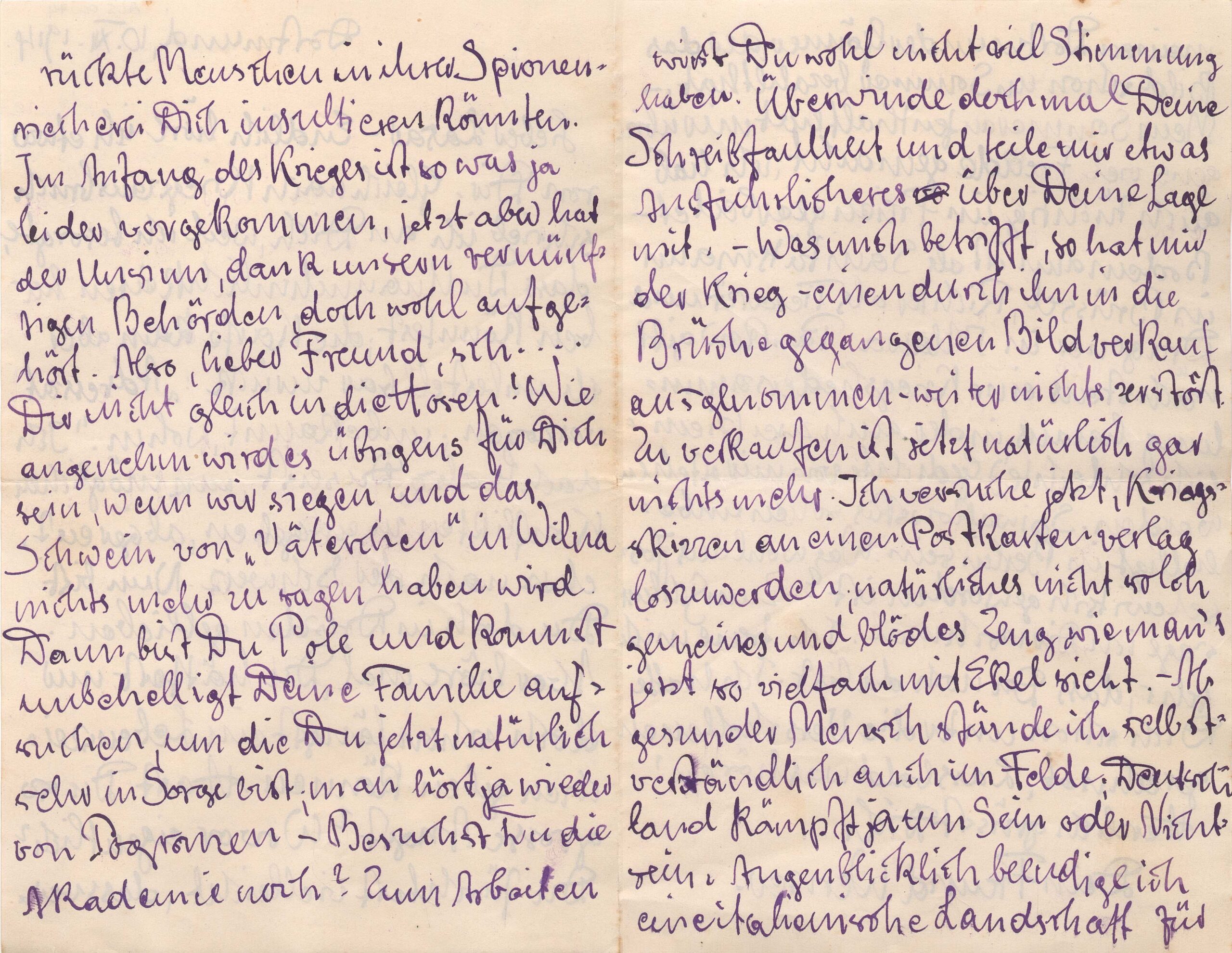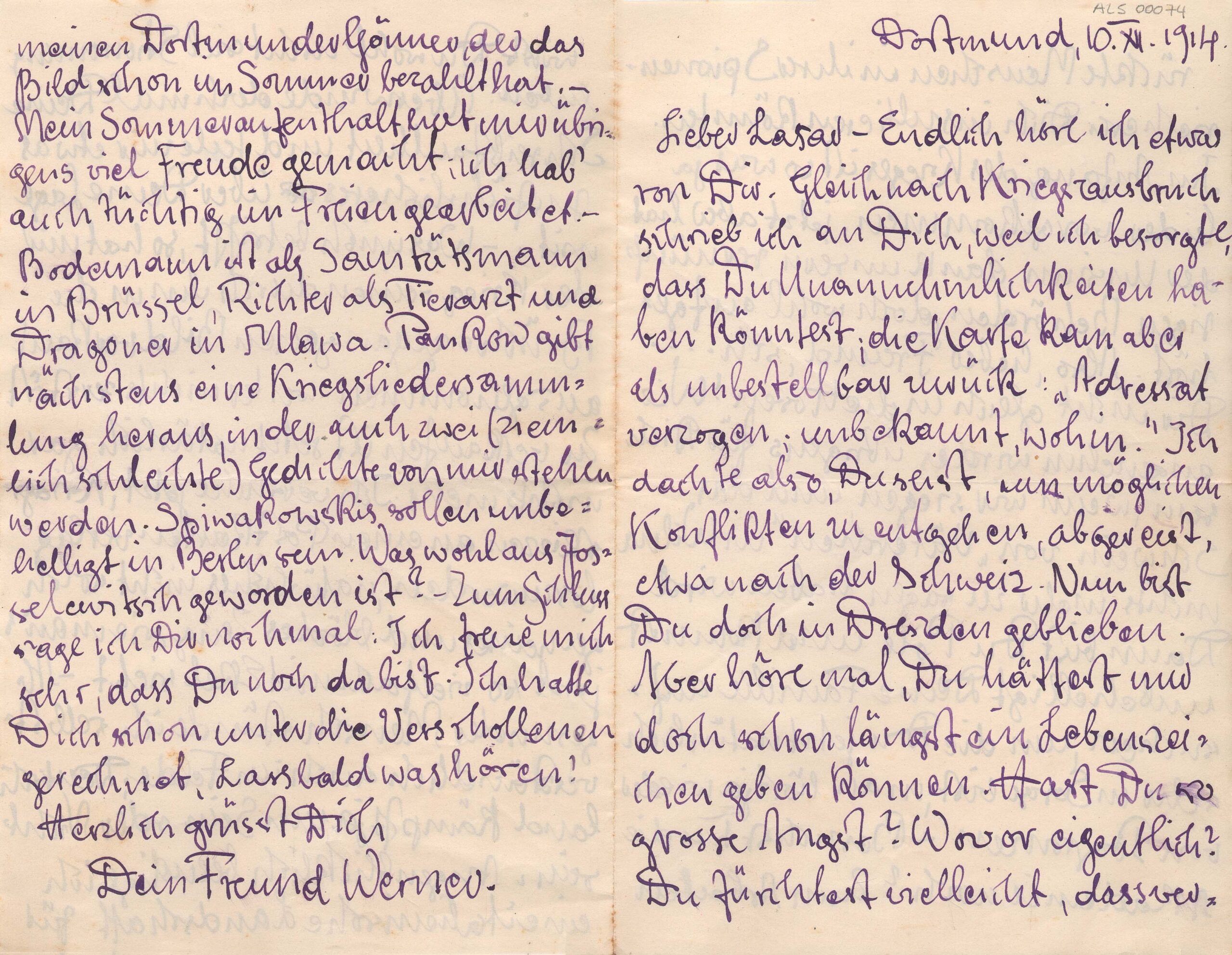 Primeira carta após a declaração de guerra [1-8-1914]. Informa ter ficado preocupado com o destino de Lasar, pois uma carta anterior, enviada imediatamente após o início da Guerra, havia sido devolvida com aviso de "paradeiro desconhecido"; diz ter imaginado que Lasar fugira do conflito, talvez em direção à Suíça, e declara-se aliviado por saber de sua permanência em Dresden; relata ter ouvido relatos de pogroms em Wilna, e imagina que Lasar esteja muito preocupado com a família. Pensa que para Lasar seria melhor uma vitória da Alemanha: cessaria o violento domínio russo em Wilna, Lasar tornaria-se polonês e poderia visitar sua família sem empecilhos. Pergunta a Lasar se ainda frequentava a Academia. Diz ter trabalhado bastante nas férias de verão, realizando muitas pinturas ao ar livre; diz ter vendido uma "paisagem italiana" a seu patrono de Dortmund; diz ainda estar tentando encontrar uma editora de cartões postais para a qual possa enviar esboços com cenas de guerra. Cita as seguintes pessoas: [Max] Bodemann (servindo nos Corpos Médicos em Bruxelas) Richter (como veterinário em Mlawa, Polônia), Pankow (que em breve publicaria uma coleção de canções de guerra, na qual figurariam dois poemas de Schultz), Spiwakowskis (que estava em Berlin) e Josselewitch (de quem diz nada saber]