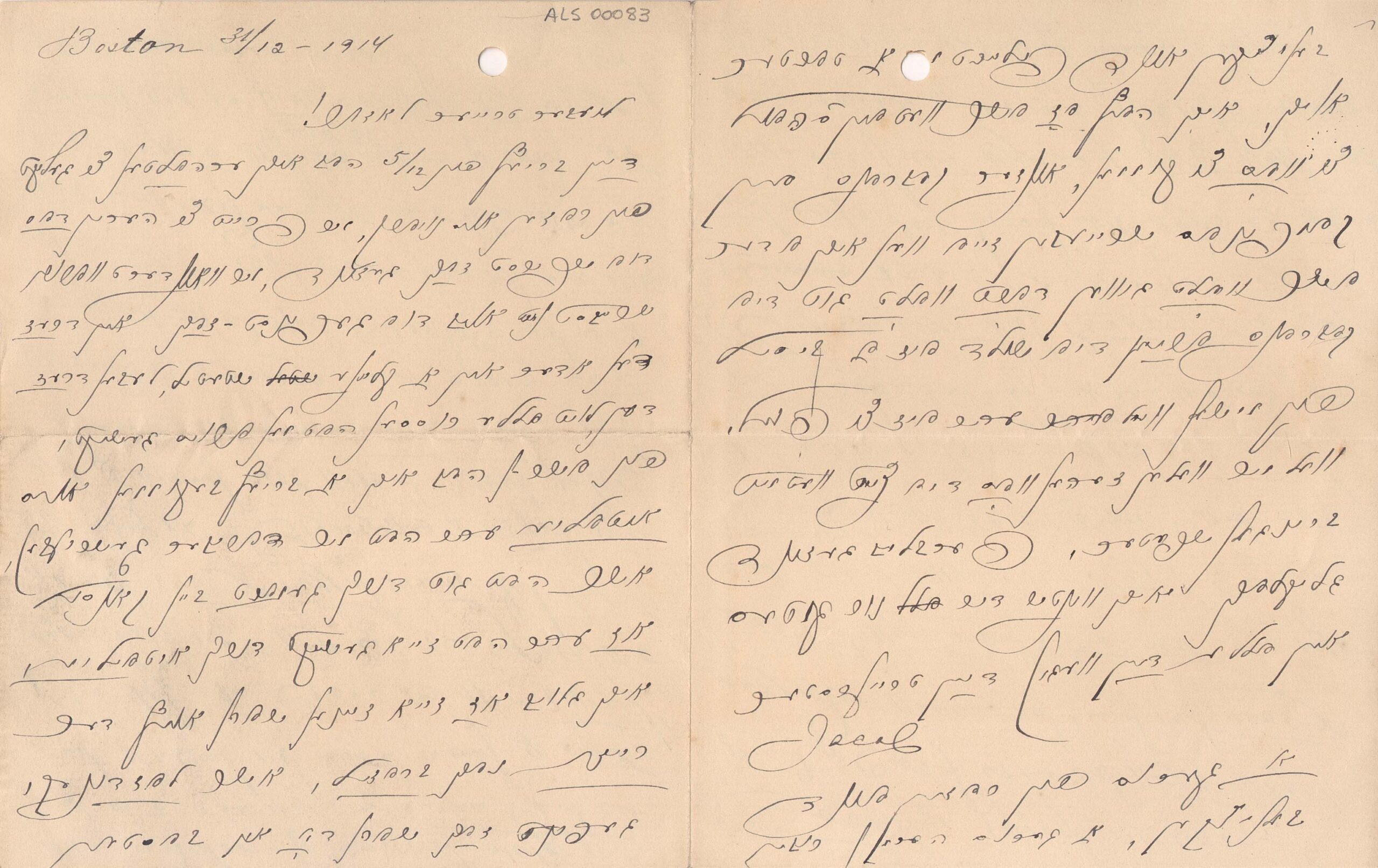 Diz que recebeu a carta de Segall de 5-12, remetida pela Rosa de Nova York; está surpreso por Segall não dizer se estava em Dresden ou na pequena cidade perto de Dresden para onde foram levados todos os russos; recebeu carta do irmão Oscher, da Itália, contando sobre isso; Oscher e a família estão a caminho do Brasil, mas passou um mal bocado com o cônsul, que o fez viajar através da Itália; Benny já está em Boston e manda lembranças; Jacob recebeu do pai as mezuzót e as vendeu logo, enviando para ele 65 rublos, através de um banco, para que recebesse logo o dinheiro; está há oito dias em Boston e recebeu as boas vindas de um grupo de conhecidos - Braude, Max, Meyer, Vidger, Koifman (Kaufman, o sogro e sogra do Koifman; talvez pudesse negociar os quadros maiores com os portugueses, mas isso teria um custo; viaja no dia 2 de janeiro para Nova York; na primeira oportunidade tentará voltar ao Brasil com a família; a cobrança do escritório de Campinas não está bem, e eles dizem que se Jacob e Oscher estivessem lá seria melhor; espera para ver o que o tempo lhes reserva no futuro