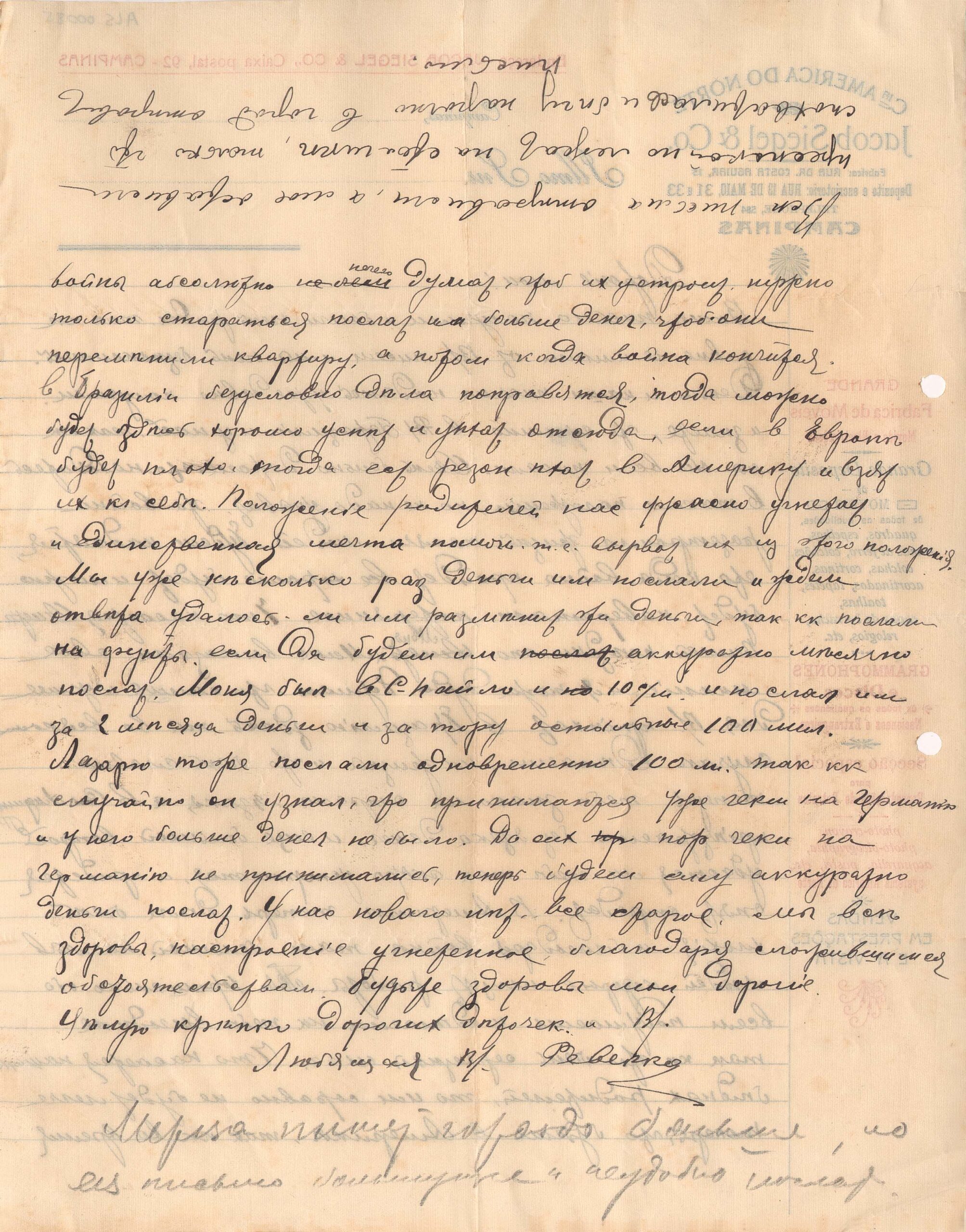 Manda notícias do Brasil; lamenta-se da situação difícil causada pela guerra mas diz acreditar que assim que ela terminar começará um tempo de reconstrução e prosperidade. Sugere a Oscar que abandone a ideia de migrar para a Europa e insiste para que ele pense em se fixar na América. Demonstra preocupação com o destino dos pais em Vilna; informa ter enviado dinheiro a Lasar Segall na Alemanha.