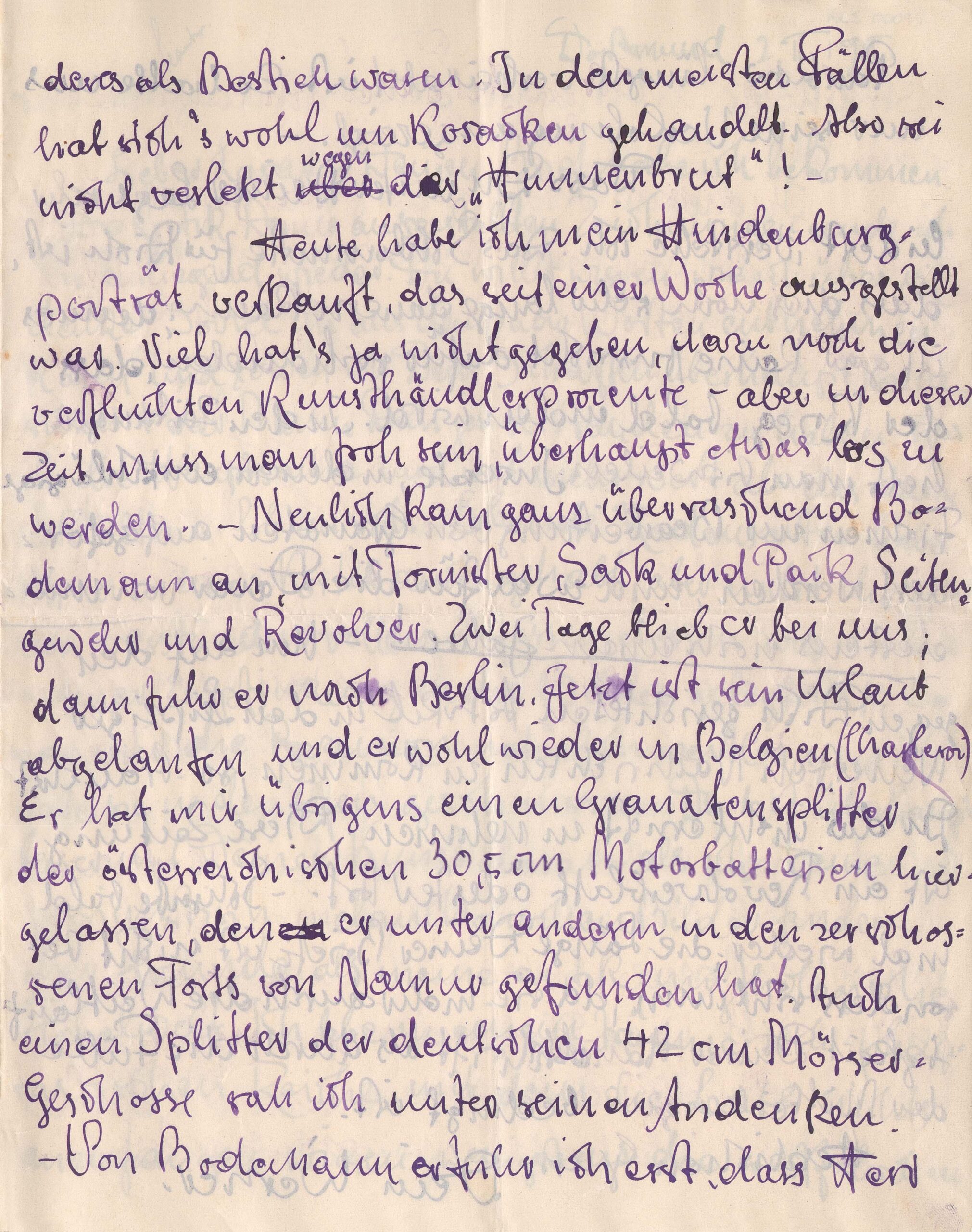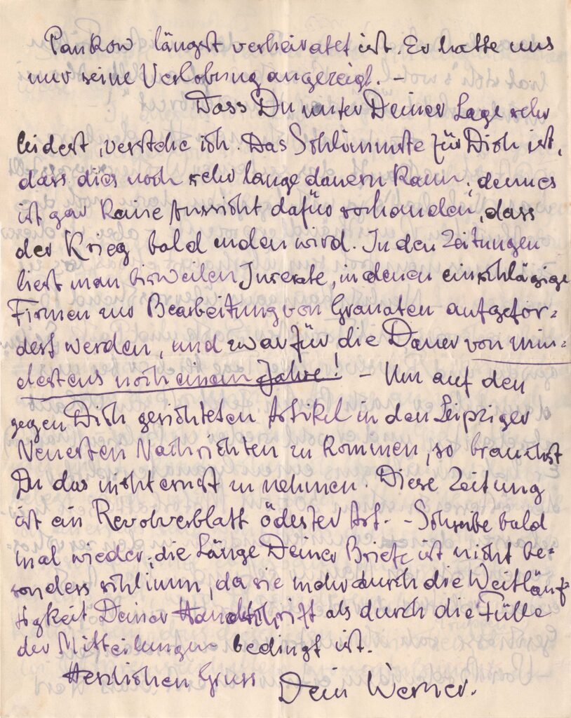 Diz devolver em anexo a esta carta a crítica de uma exposição de desenhos de Lasar; a crítica parece ser negativa; Schultz diz acreditar que o autor dela não entendeu o trabalho de Lasar; diz ter ocorrido o mesmo consigo, e que, em comparação, a arte "pessimista e melancólica" de Lasar vinha encontrando mais admiradores que a sua, pejada de elementos da mitologia antiga, do mundo das fábulas, especialmente incompreendida, segundo afirma, pelos habitantes de sua região (Westfália), que ele denomina pejorativamente de "cabeças-de-palha"; diz enviar em anexo também uma cópia da coletânea de canções e poemas dirigida por Angelo Pankow, contendo inclusive dois poemas de sua autoria; lamenta-se pela irregularidade das contribuições, citando como ponto baixo os trabalhos de Helene Steikel; avisa a Lasar que o exército russo é tratado com pouco respeito em alguns trechos da obra, inclusive em seus dois poemas, e pede antecipadamente desculpas por isso; diz reconhecer que há naquele grupo pessoas tão boas como as há entre os alemães, mas que havia também, especialmente entre as tropas russas na Prússia Oriental, indivíduos que não passavam de "bestas"; diz ainda que os judeus daquela região foram as maiores vítimas dos "cossacos". Informa ter vendido o retrato de Hindenburg, após tê-lo mantido em exposição por uma semana; reclama que pouco lucrou com essa venda, especialmente depois de descontada a porcentagem do negociante de artes que a agenciou. Diz ter recebido uma visita surpresa de [Max] Bodemann, que apareceu em sua porta em traje militar completo, gozando uma licença do serviço; permaneceu em sua casa por dois dias; Bodemann presenteou Schultz com suvenires de guerra: fragmentos de granadas e munições de artilharia colhidos no palco de operações; diz que Bodemann lhe informara de que o Sr. Pankow havia já há bastante tempo se casado, e diz a Lasar que soubera apenas de seu noivado. Diz lamentar os sofrimentos relatados por Lasar, todos oriundos da situação de guerra; lamenta-se também que tudo indique que a guerra ainda vá durar muito tempo, e como indício desta previsão, cita anúncios que às vezes via-se nos jornais, onde firmas fabricantes de granadas recebiam contratos do governo para continuarem a produção por pelo menos mais um ano; finalmente, diz a Lasar que não se aborreça com o artigo que contra ele fora publicado no "Leipzigen Neuesten Nachrichten", afirmando ser este uma "jornal de escândalos" que não merece ser tomado seriamente