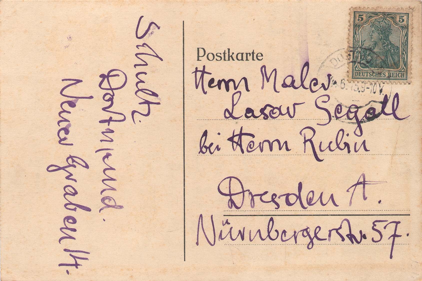 Endereçado a: Herrn Maler Lasar Segall, bei Herrn Rubin. Dresden-A, Nürnbergerstr. 57