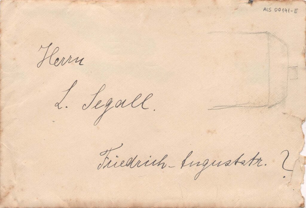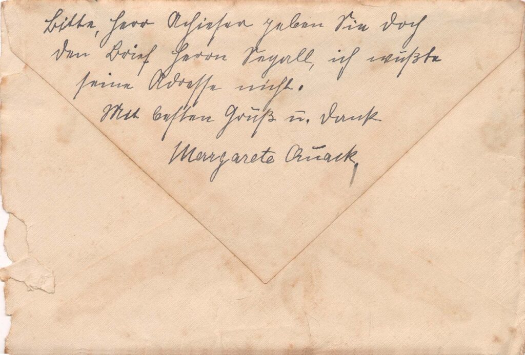 Acompanha envelope; Post scriptum no verso do envelope, assinado Margarete Quack; na frente, pequeno esboço de uma casa a grafite
