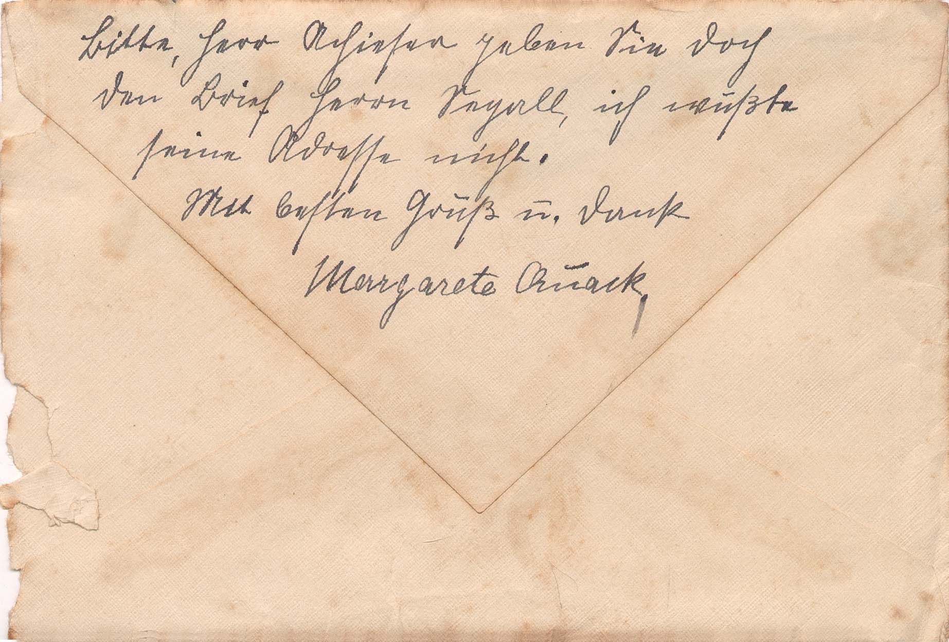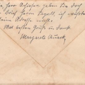Acompanha envelope; Post scriptum no verso do envelope, assinado Margarete Quack; na frente, pequeno esboço de uma casa a grafite