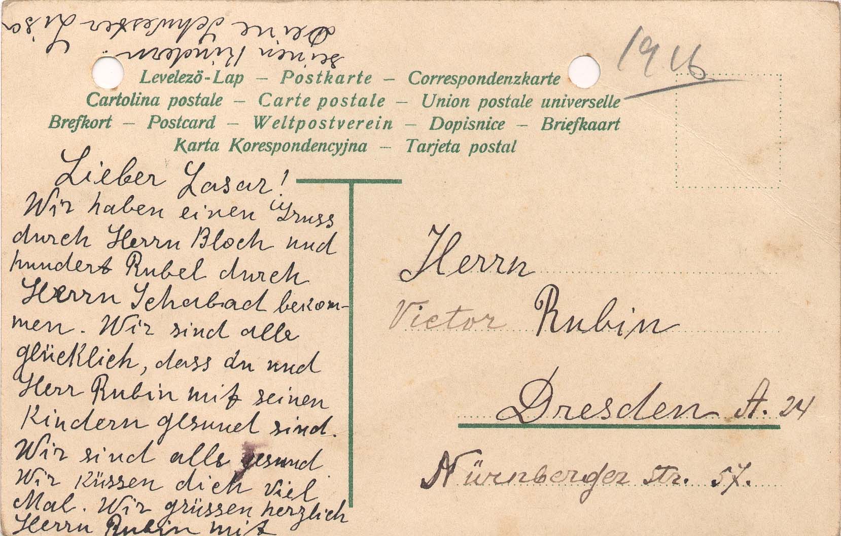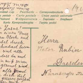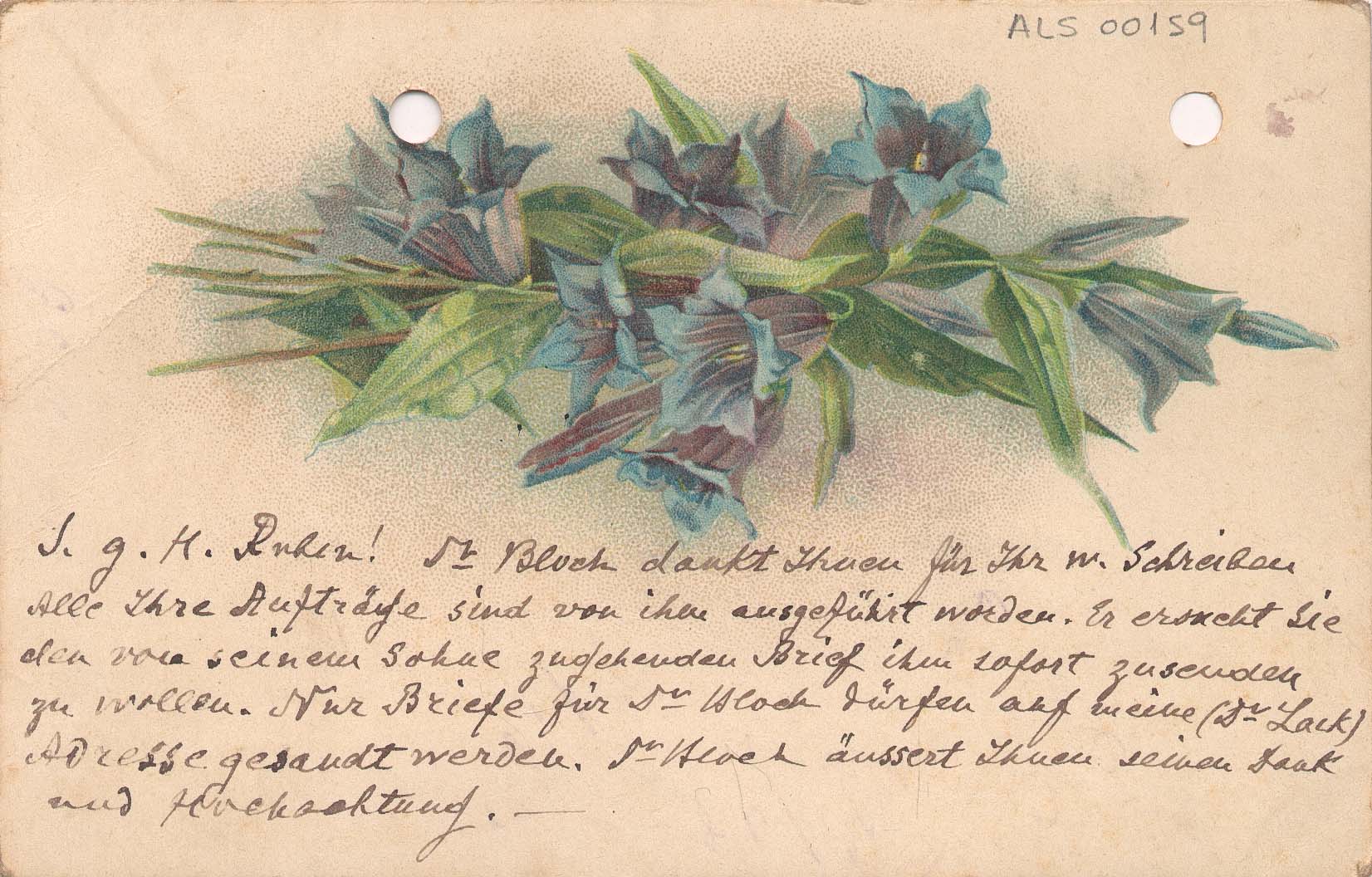 Na frente, ilustração com flores azuis; no verso, anotado a grafite, provavelmente por Segall: 1916