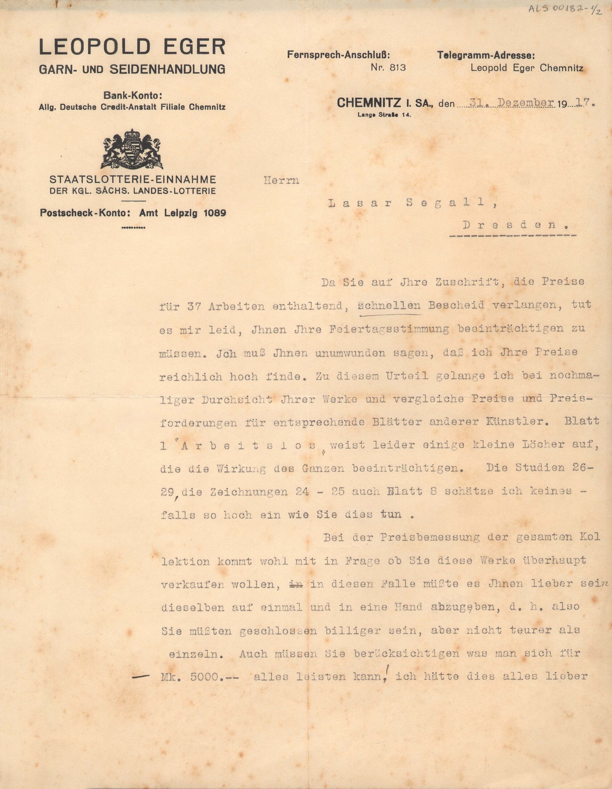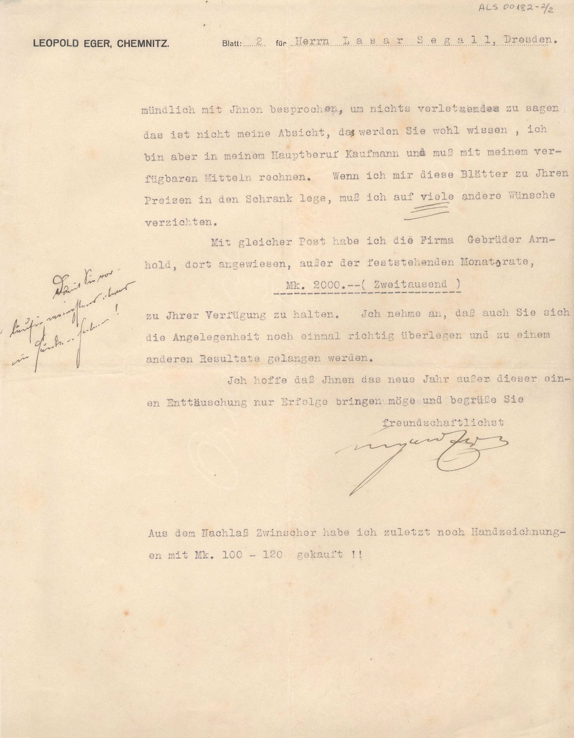 Papel timbrado: Leopold Eger. Garn- und Seidenhandlung. Lange Strasse, 14; na segunda folha, margem esquerda, anotação manuscrita; Cópia xerox: Reserva Técnica, Armário de aço, Gaveta 1, Pasta 1911-1920