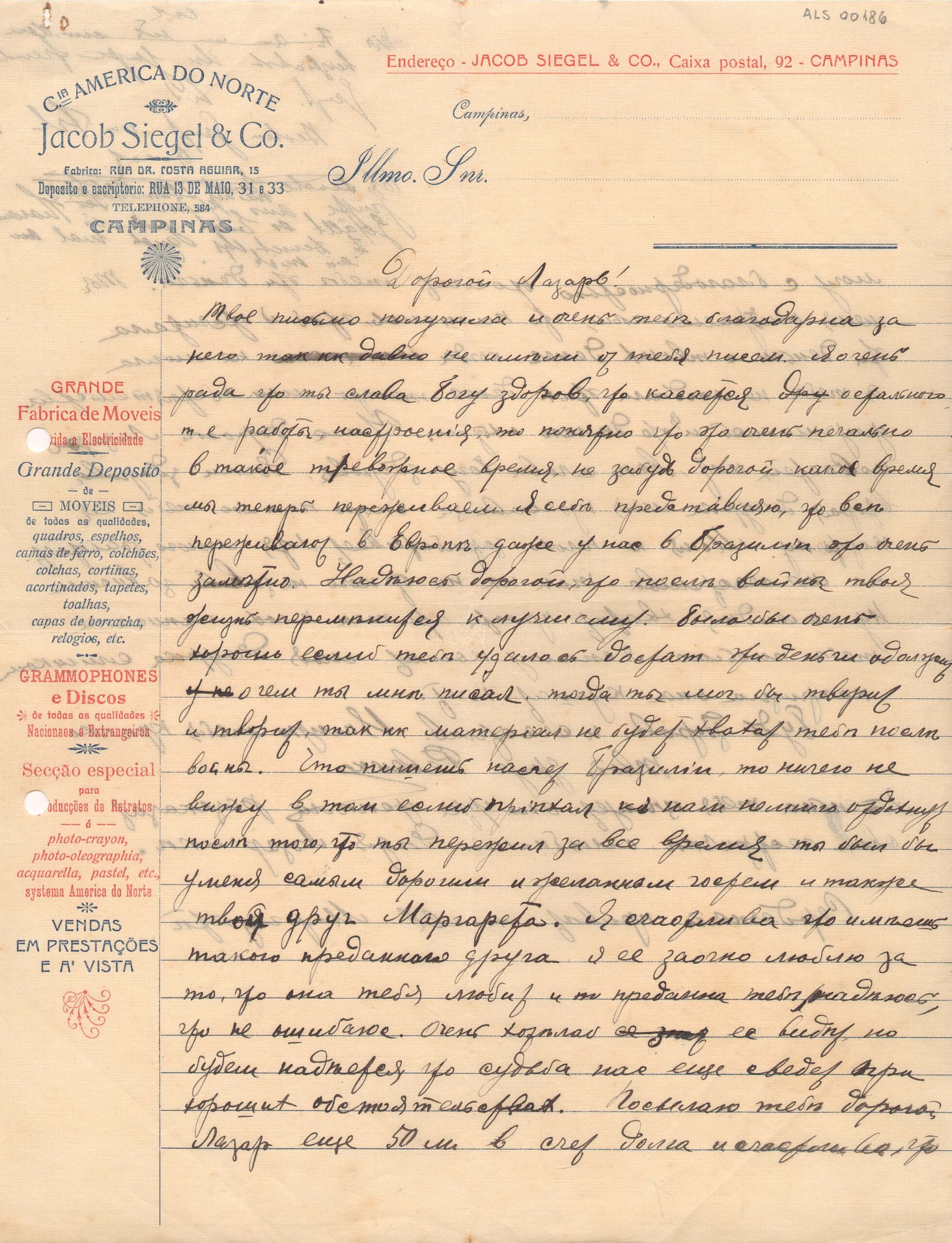 Papel timbrado: Cia America do Norte. Jacob Siegel & Co; na segunda página, anotação manuscrita por Segall, em alemão, c.s.d.. No documento ALS 00187, havia um bilhete anexo: "até aqui - essas cartas estavam grampeadas junto com a de ´31-5´ - sem identificação do ano" (letra Vera d´Horta). A carta de 31-5 corresponde a ALS 00184