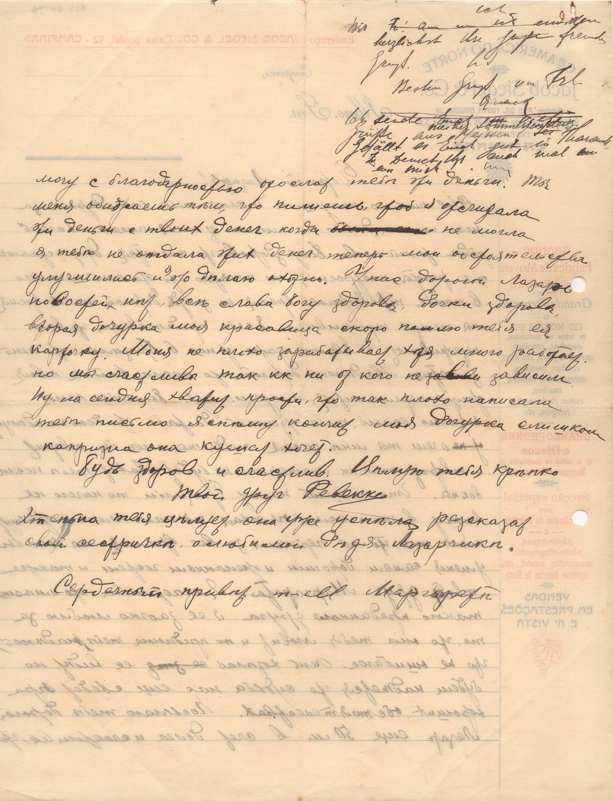 Papel timbrado: Cia America do Norte. Jacob Siegel & Co; na segunda página, anotação manuscrita por Segall, em alemão, c.s.d.. No documento ALS 00187, havia um bilhete anexo: "até aqui - essas cartas estavam grampeadas junto com a de ´31-5´ - sem identificação do ano" (letra Vera d´Horta). A carta de 31-5 corresponde a ALS 00184