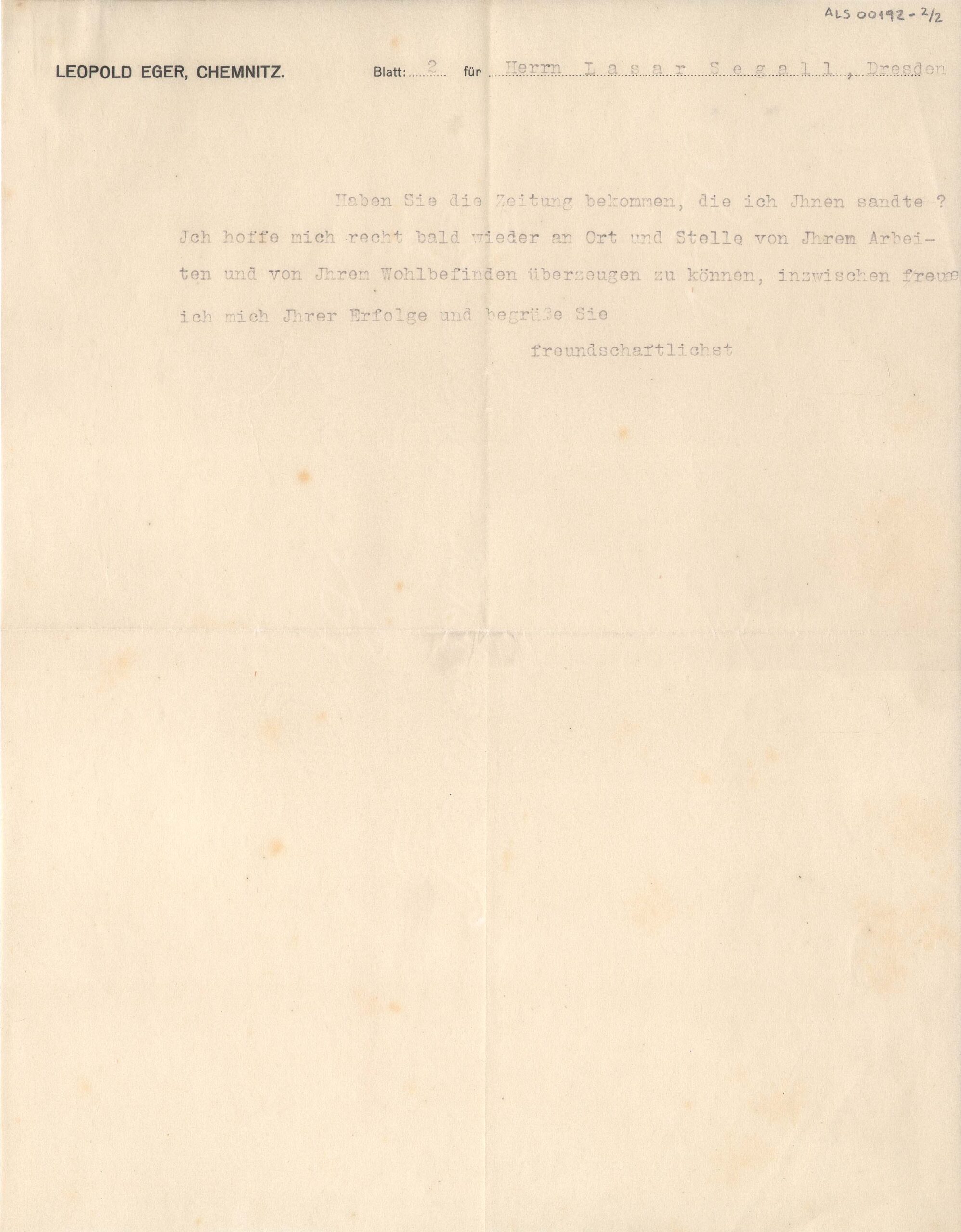 Papel timbrado: Leopold Eger, Garn- und Seidenhandlung; carta não assinada; diversos grifos: a grafite [de Segall] e a lápis azulado [provavelmente do autor]; Cópia xerox: Reserva Técnica, Armário de aço, Gaveta 1, Pasta 1911-1920