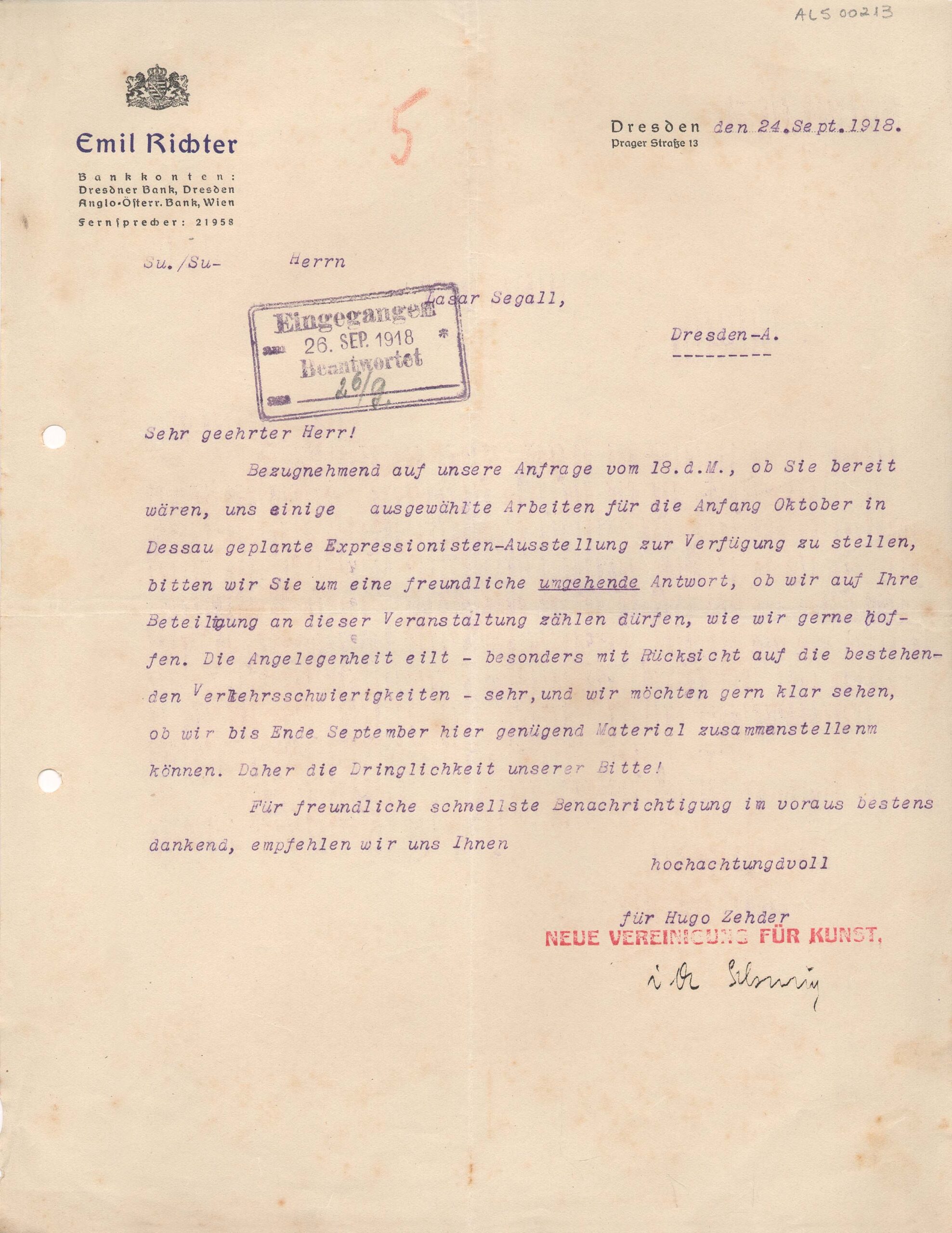 Papel timbrado: "Emil Richter; Bankkonten: Dresdner Bank, Dresden. Anglo-Ossterr.Bank, Wien.". Carimbo: em azul: "Eingegangen 26 sep. 1918; Beantwortet 26-2". Marcação a lápis vermelho com o número 5 / Item Relacionado: ALS 00214: resposta dizendo que Segall está na Rússia e não poderá participar da Exposição dos Expressionistas, em Dessau