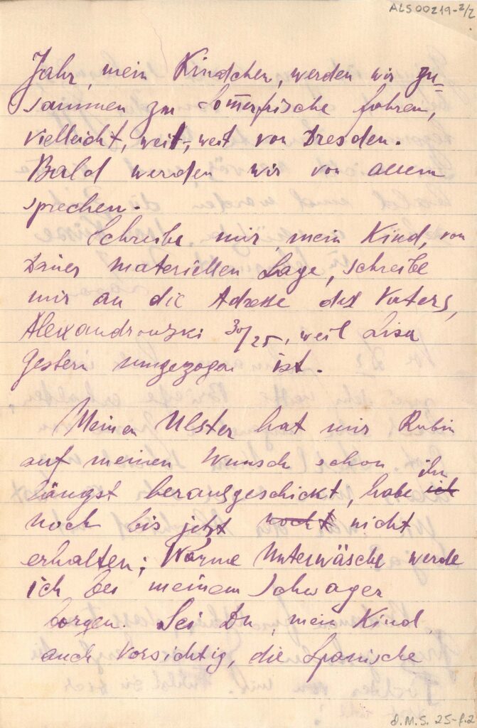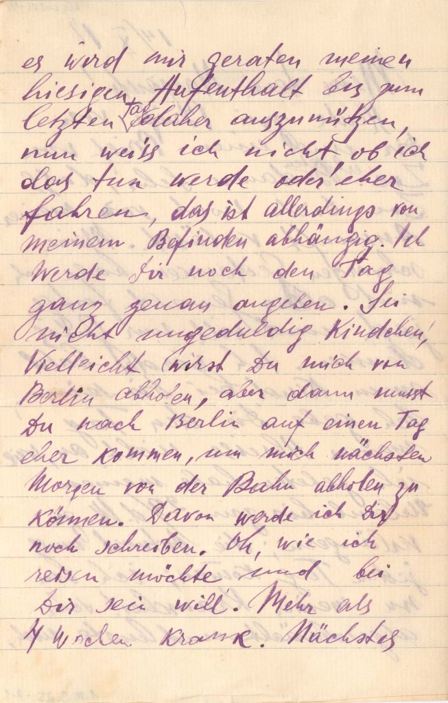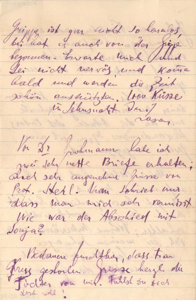 Fala que está doente, com gripe espanhola, há mais de quatro semanas; pede que Margarete escreva para o endereço do pai, Alexandrowski 30-25, Vilna