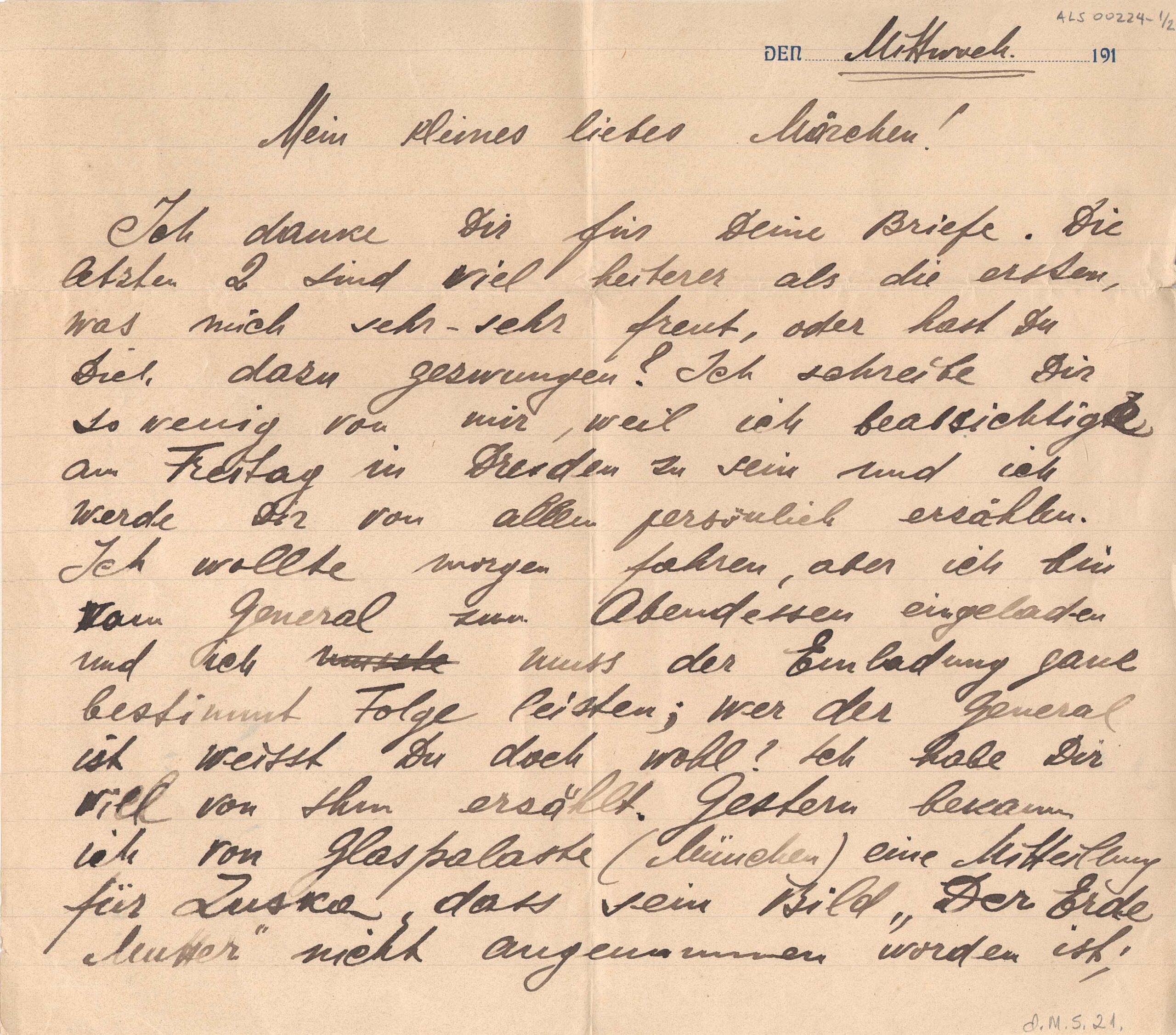 Diz que visitou cinco exposições em Berlim, inclusive a Grosse Berliner [Grande Exposição de Arte de Berlim]; diz que vão se encontrar na sexta-feira e que amanhã dirá em que trem chegará; na despedida, trata-a por "Skaska" [mulher de Rembrandt]