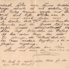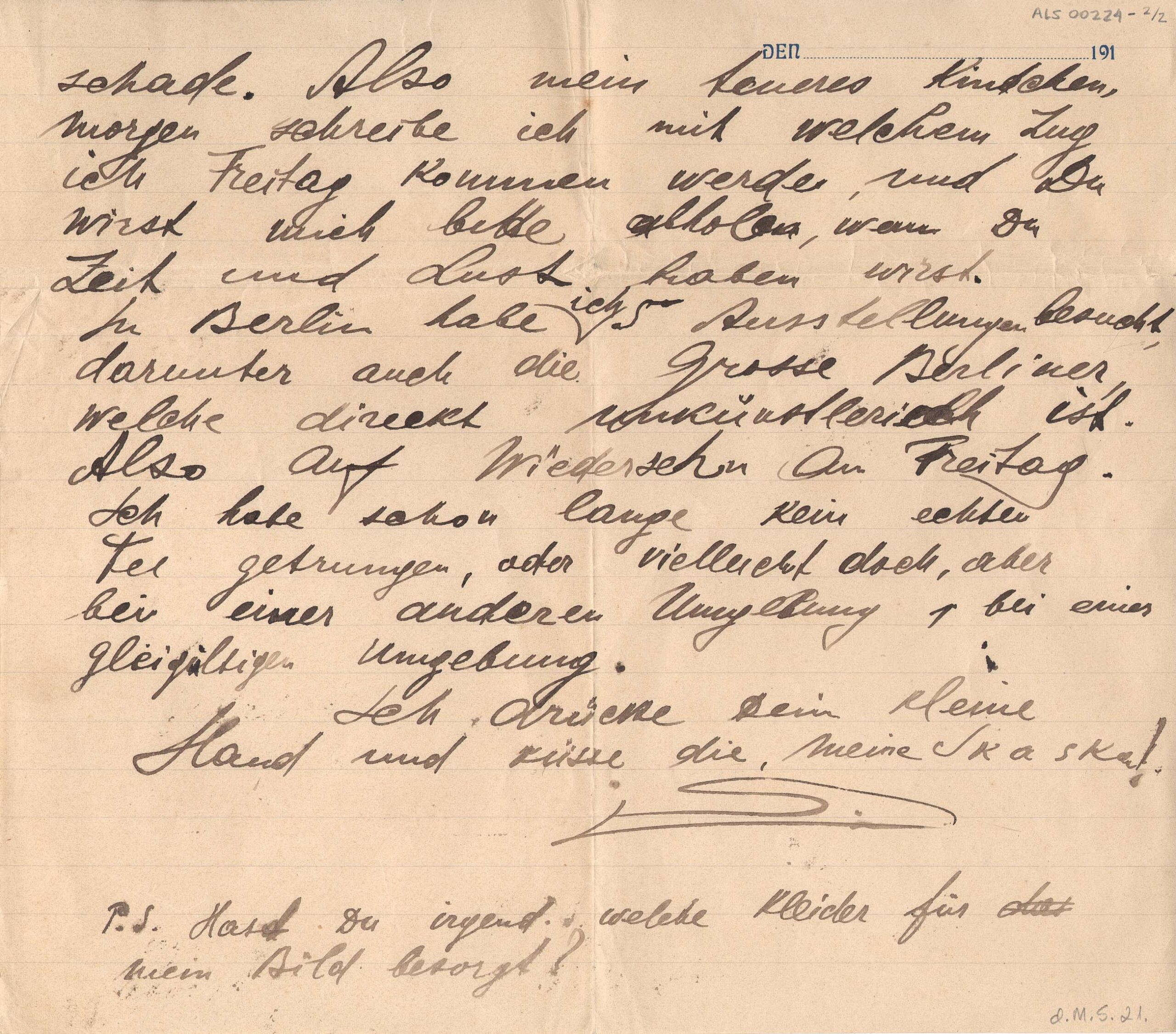Diz que visitou cinco exposições em Berlim, inclusive a Grosse Berliner [Grande Exposição de Arte de Berlim]; diz que vão se encontrar na sexta-feira e que amanhã dirá em que trem chegará; na despedida, trata-a por "Skaska" [mulher de Rembrandt]