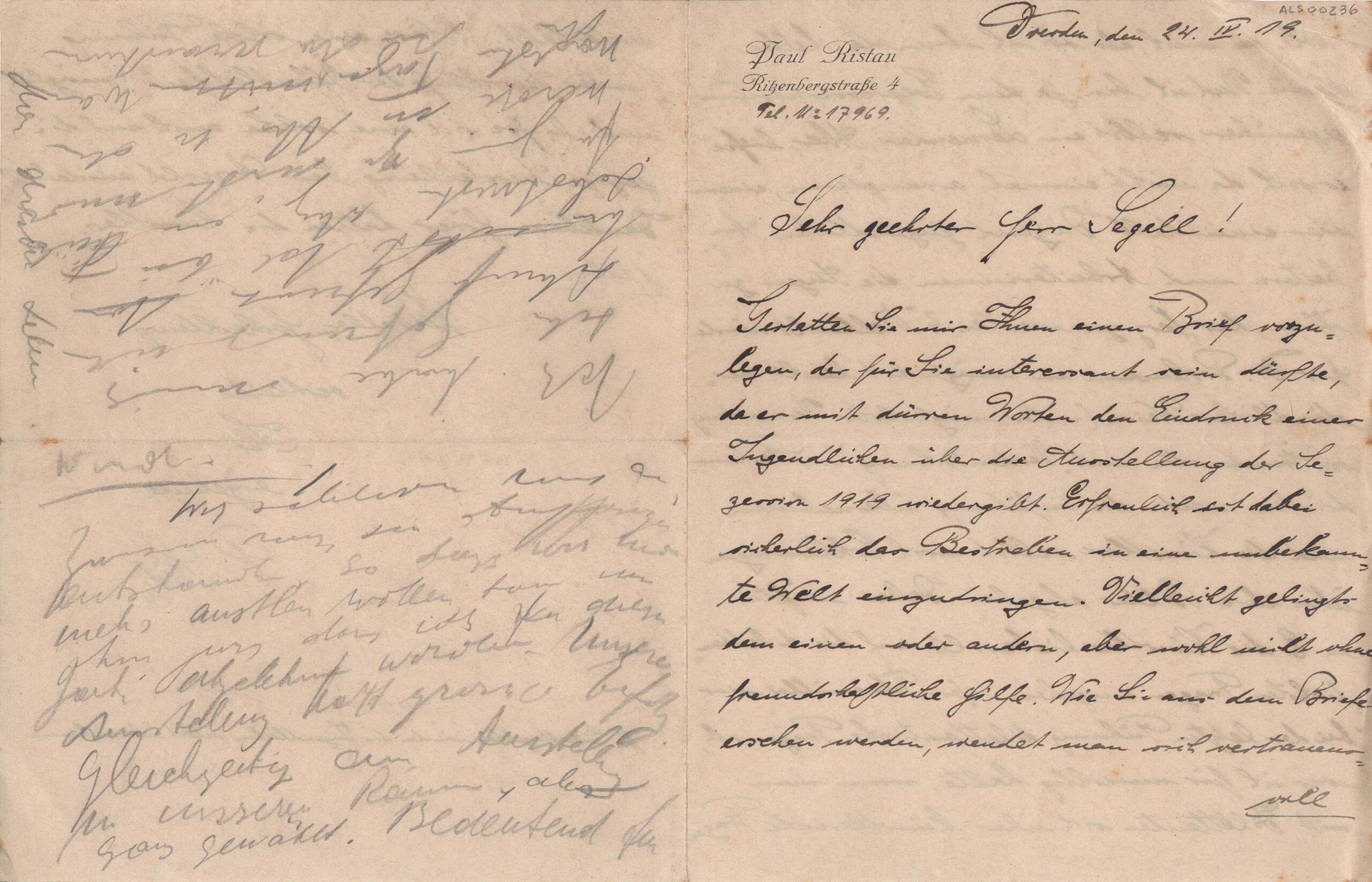 Papel timbrado: "Paul Ristau- Ritzenbergstrasse 4" e, logo abaixo, a caneta: tel.nº 17969. Há algumas anotações a grafite na última página, feitas por Segall, provável rascunho de resposta / Item Relacionado: ALS 00235