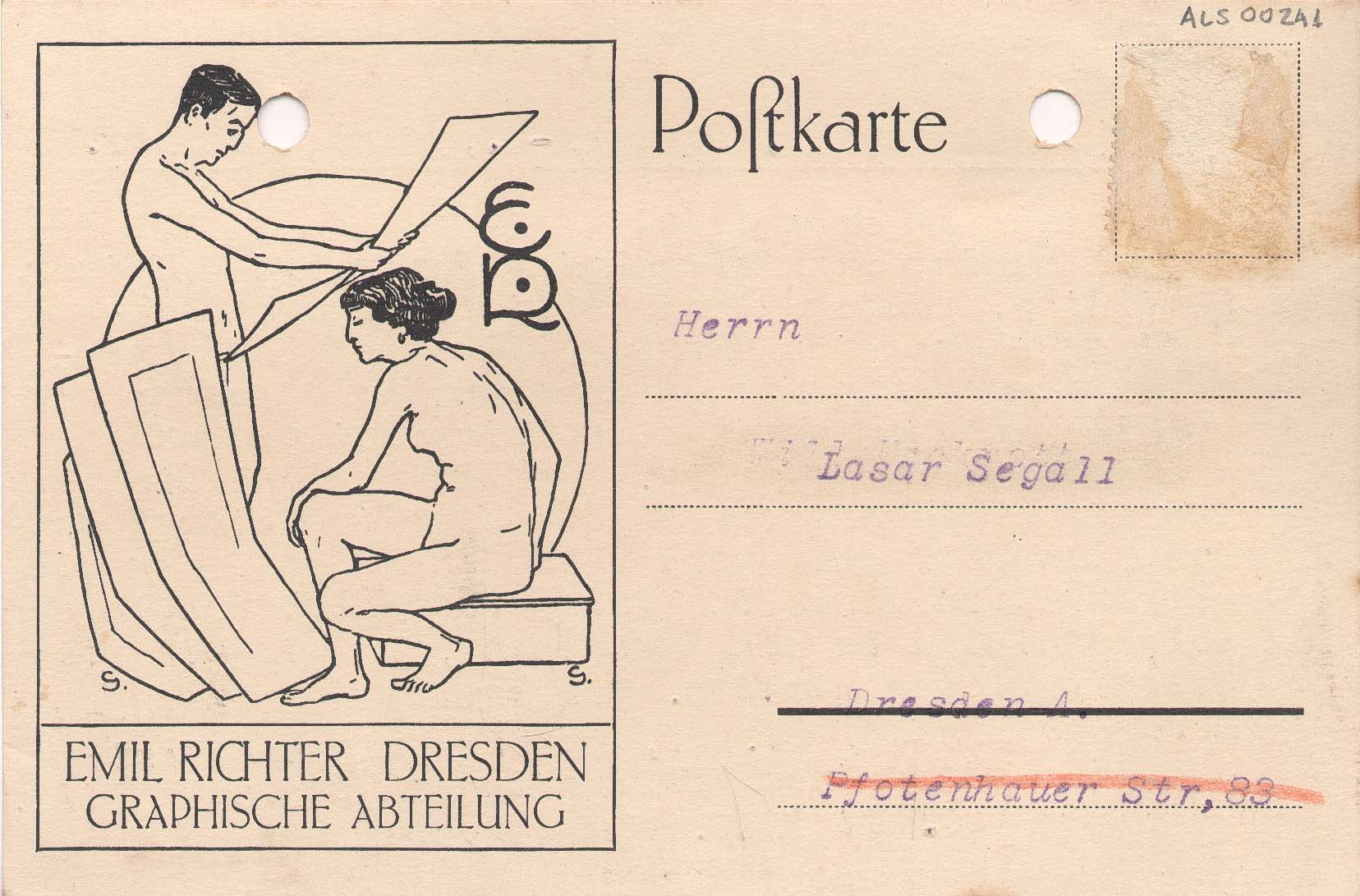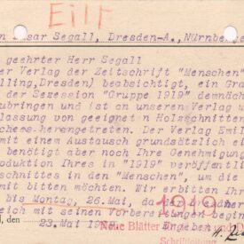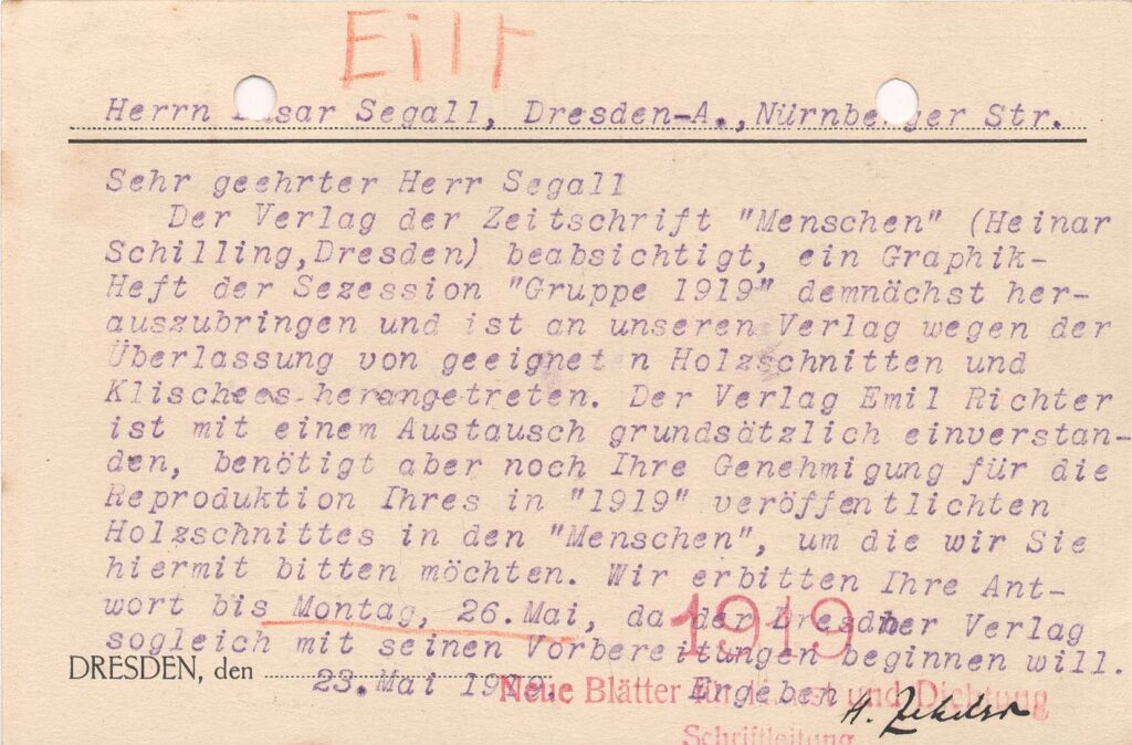 O selo foi tirado. Marcas e anotações a lápis de cor vermelho. Acima a palavra [Eilt]. O endereço: Pfotenhauer Sts, 83,foi riscado