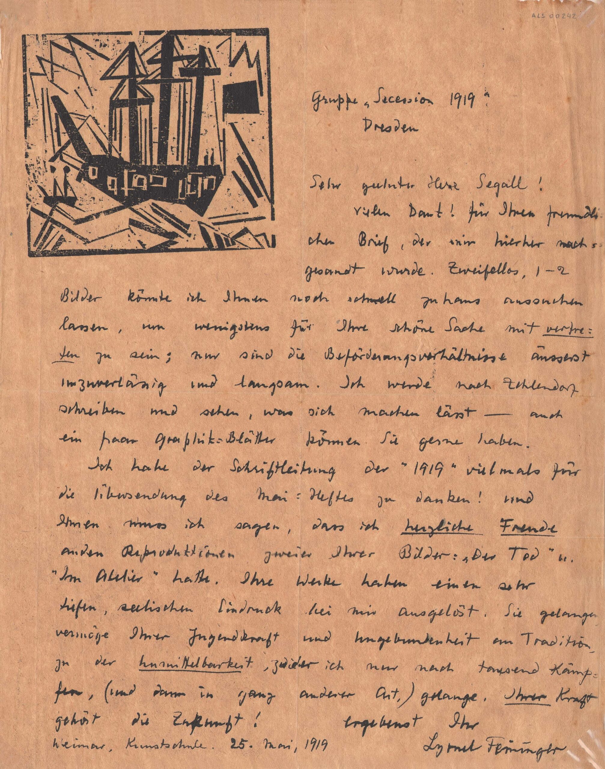 O papel de carta tem uma gravura de Feininger impressa; Cópias xerox: Reserva Técnica, Armário de aço, Gaveta 1, Pasta 1911-1920 / Item Relacionado: Segall responde em 5 de junho de 1919, a copia é o documento ALS 00246