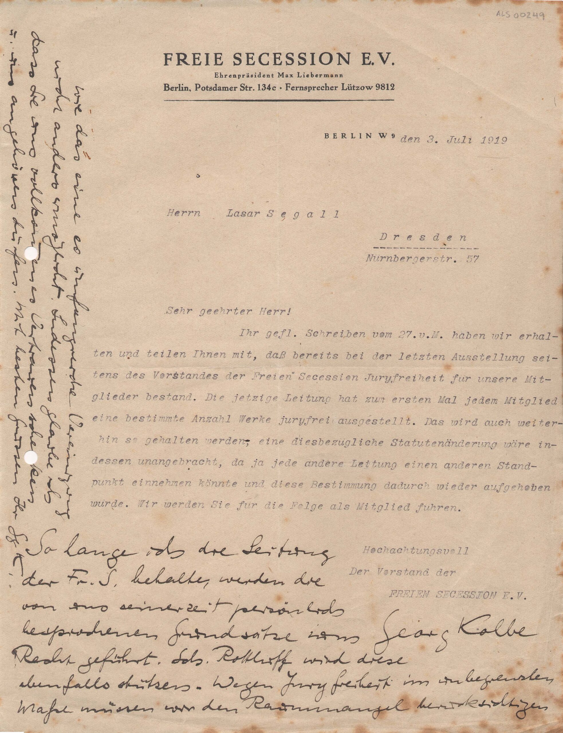 Resposta ao questionamento sobre isenção de juri, feito por Segall à direção da Freie Secession; apesar de concordar e defender os princípios colocados por Lasar Segall, Kolbe argumenta que seria impossível estender indefinidamente a isenção de juri, pois isso seria limitado pela escasez de espaço para exposição