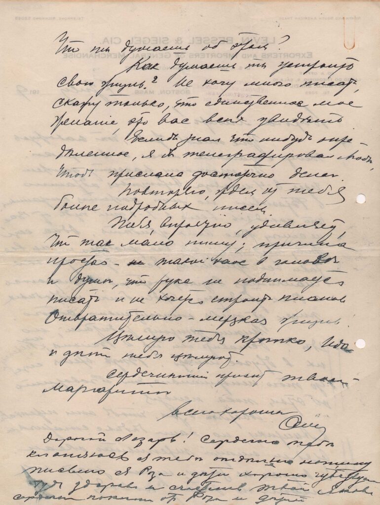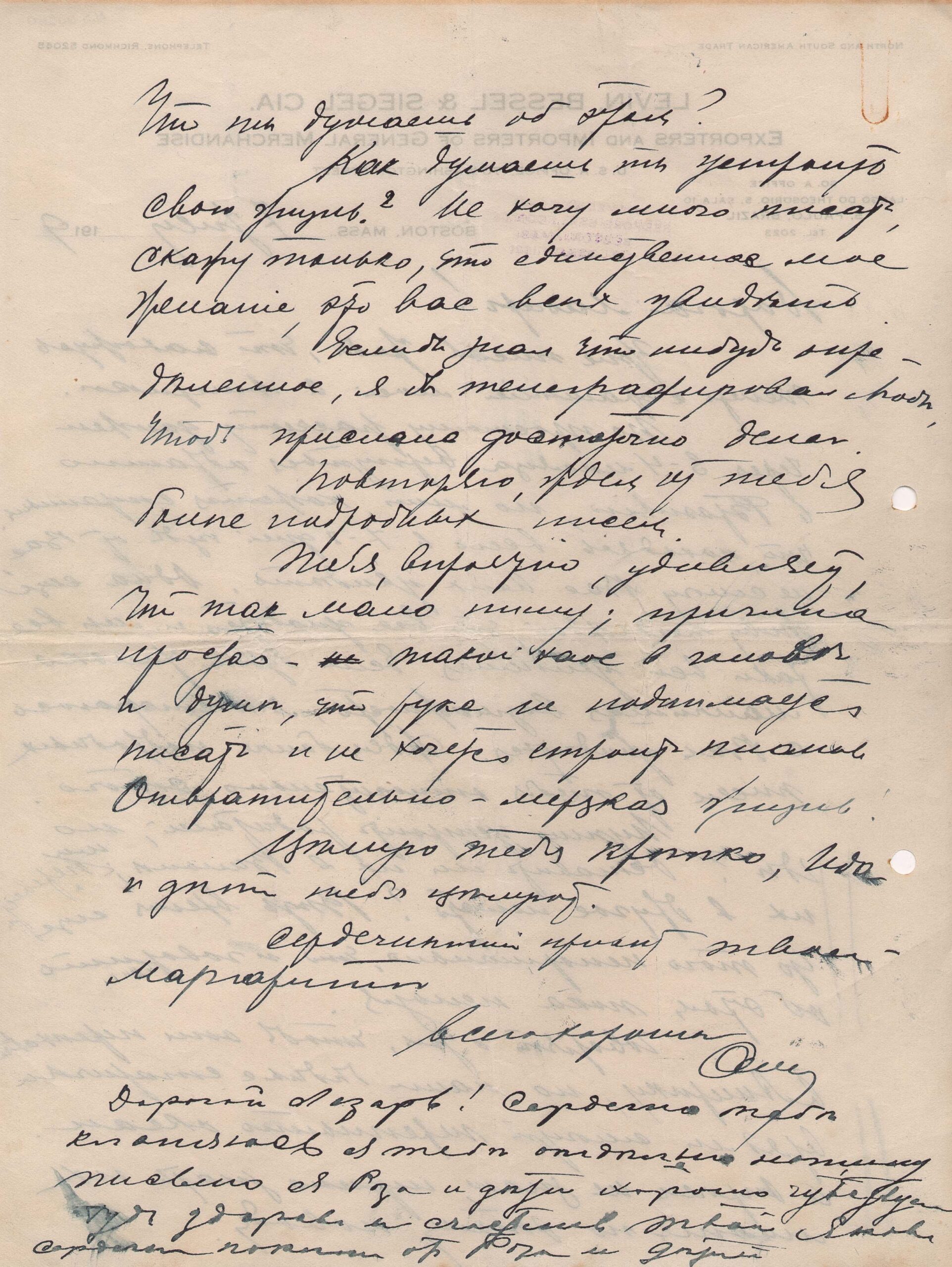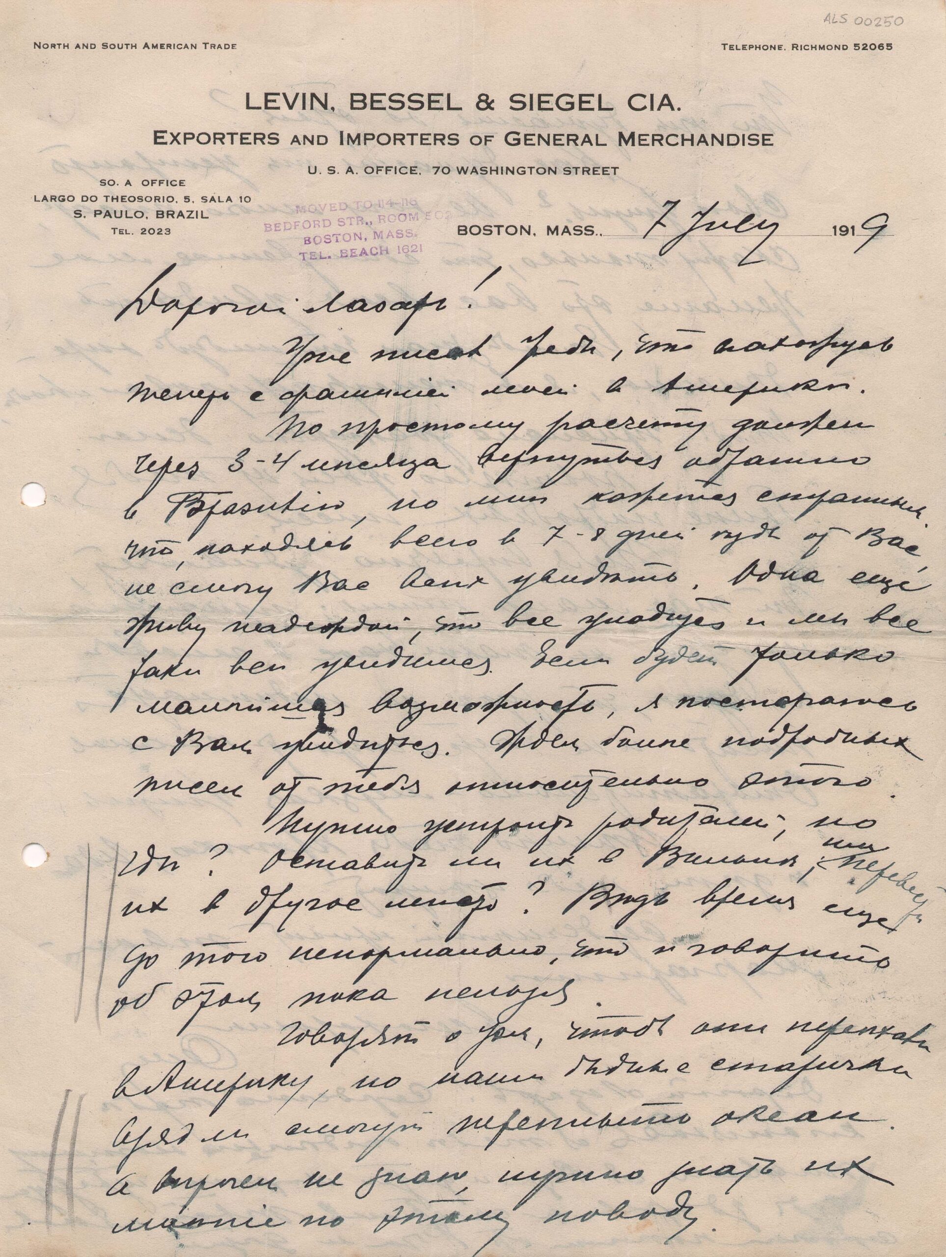 Papel timbrado: "Levin, Bessel & Siegel Cia - Exporters and importers of general merchandise". Carimbo indicando novo endereço, em Boston. Grifos a grafite na margem esquerda, provavelmente de Segall
