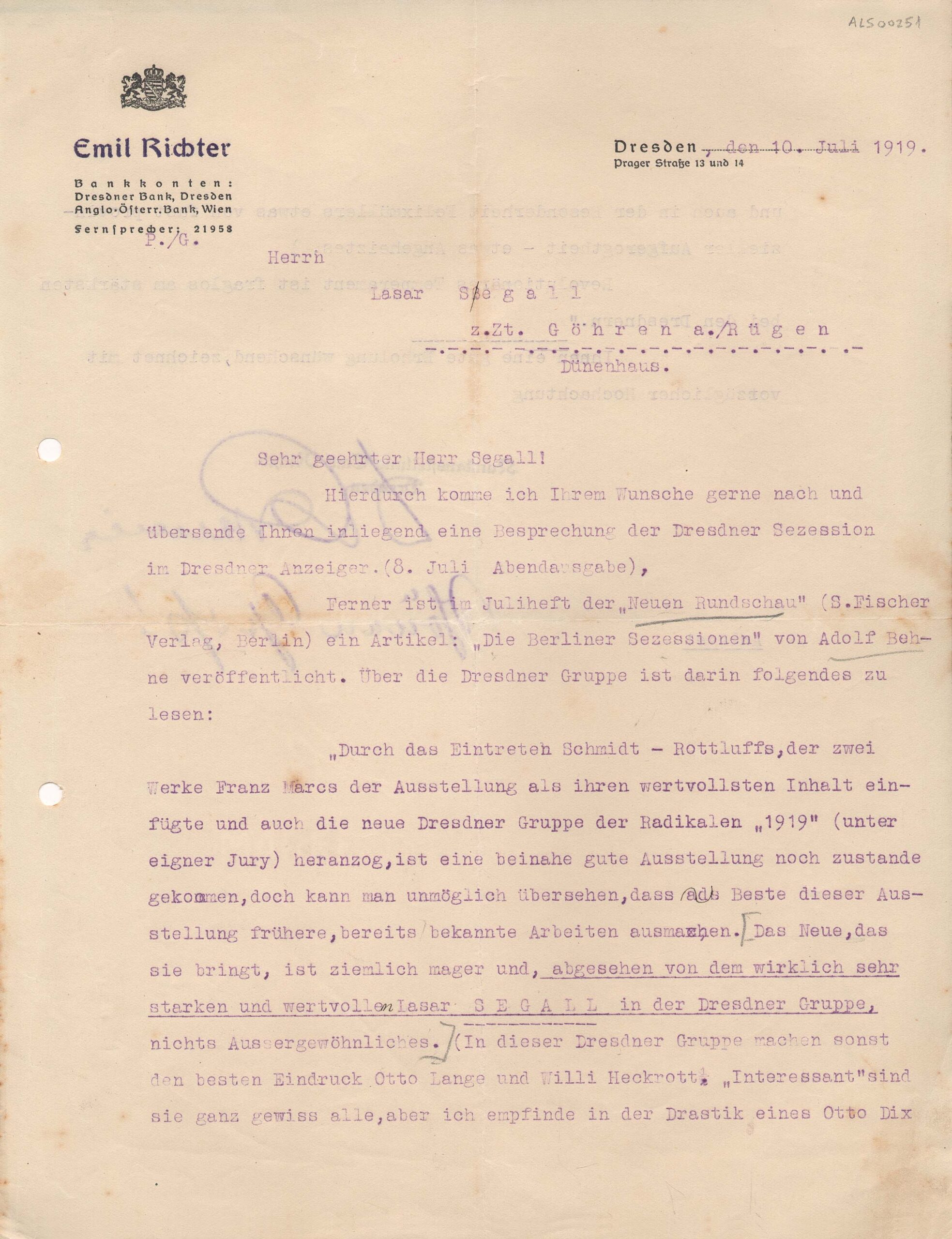 Cita trechos de um artigo publicado no Neuen Rundschau, com elogios a Segall e ao Grupo 1919 da Secessão de Dresden