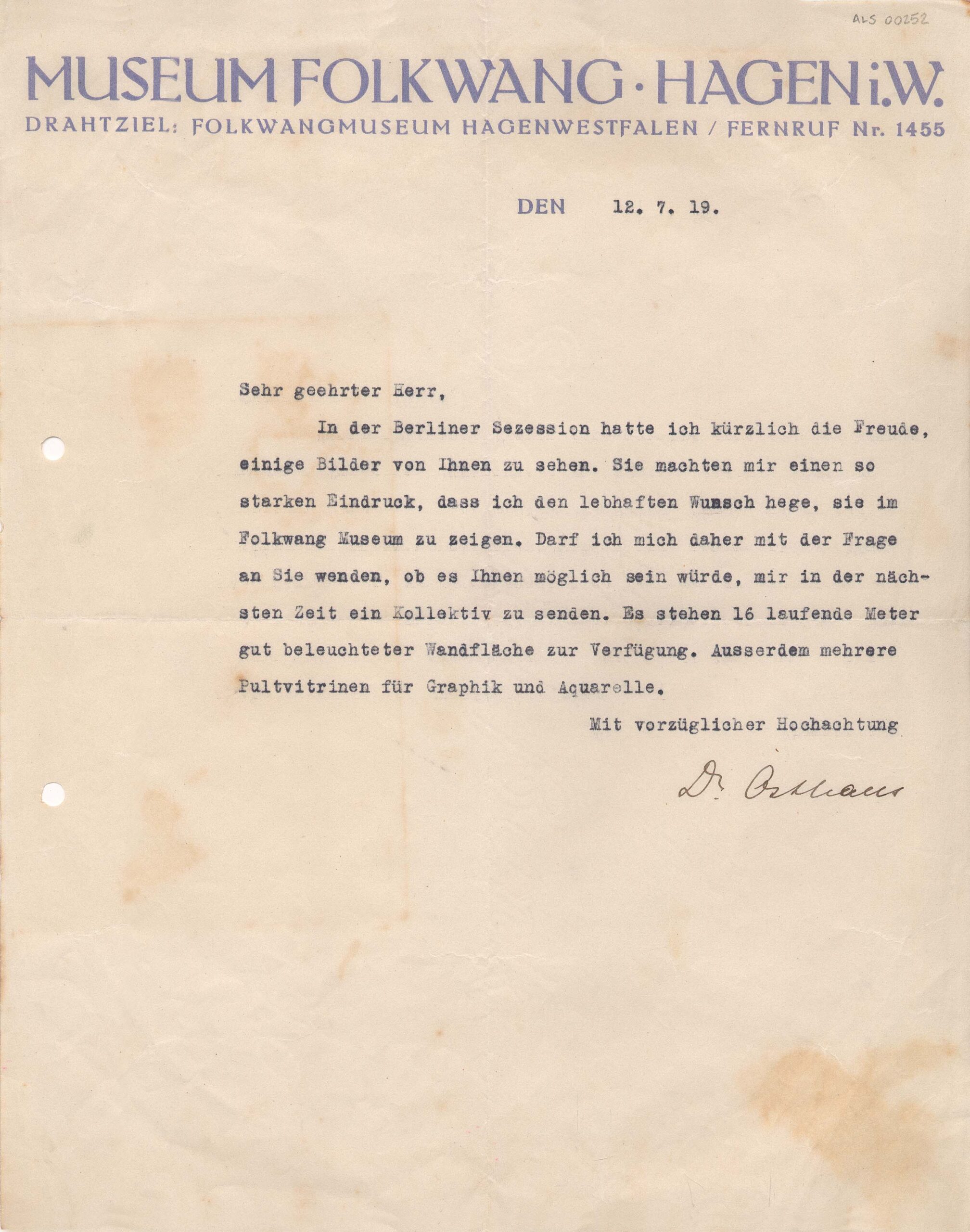 Tradução ALS 00252 Museu Folkwang â Hagen â Westfália Endereço telegráfico â Folkwang Museu Hagen Westfália/Telefone Nr. 1455 12 de julho de 1919 Caro senhor, Tive recentemente a satisfação de ver alguns de seus quadros na Secessão de Berlin. Elas me causaram tão forte impressão que agora cultivo viva intenção de as exibir no Museu Folkwang. Gostaria de perguntar ao senhor se seria possível que enviasse em breve algumas obras para uma exposição coletiva. Colocamos à disposição 16 metros de superfície bem iluminada, e ainda muitas vitrines para gravuras e aquarelas. Atenciosamente Dr. Osthaus Tradução Daniel Rincon Caires, 21 de novembro de 2016