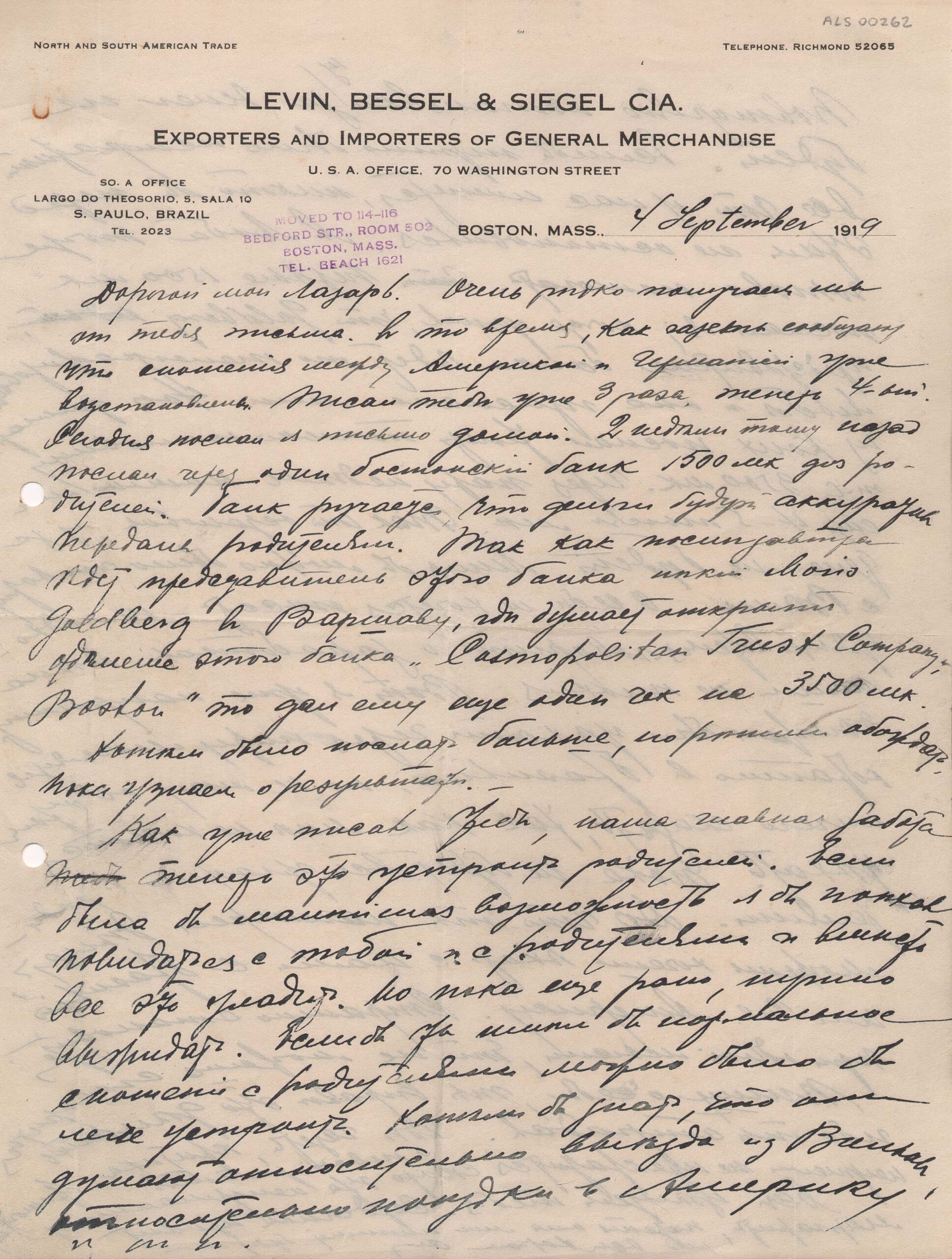 Papel timbrado: "Levin, Bessel & Siegel Cia. Exporters and Importers of General Merchandise"; carimbo: " Moved to 114-116 Bedford Str. Room 502 Boston, Mass. Tel. Beach 1621"