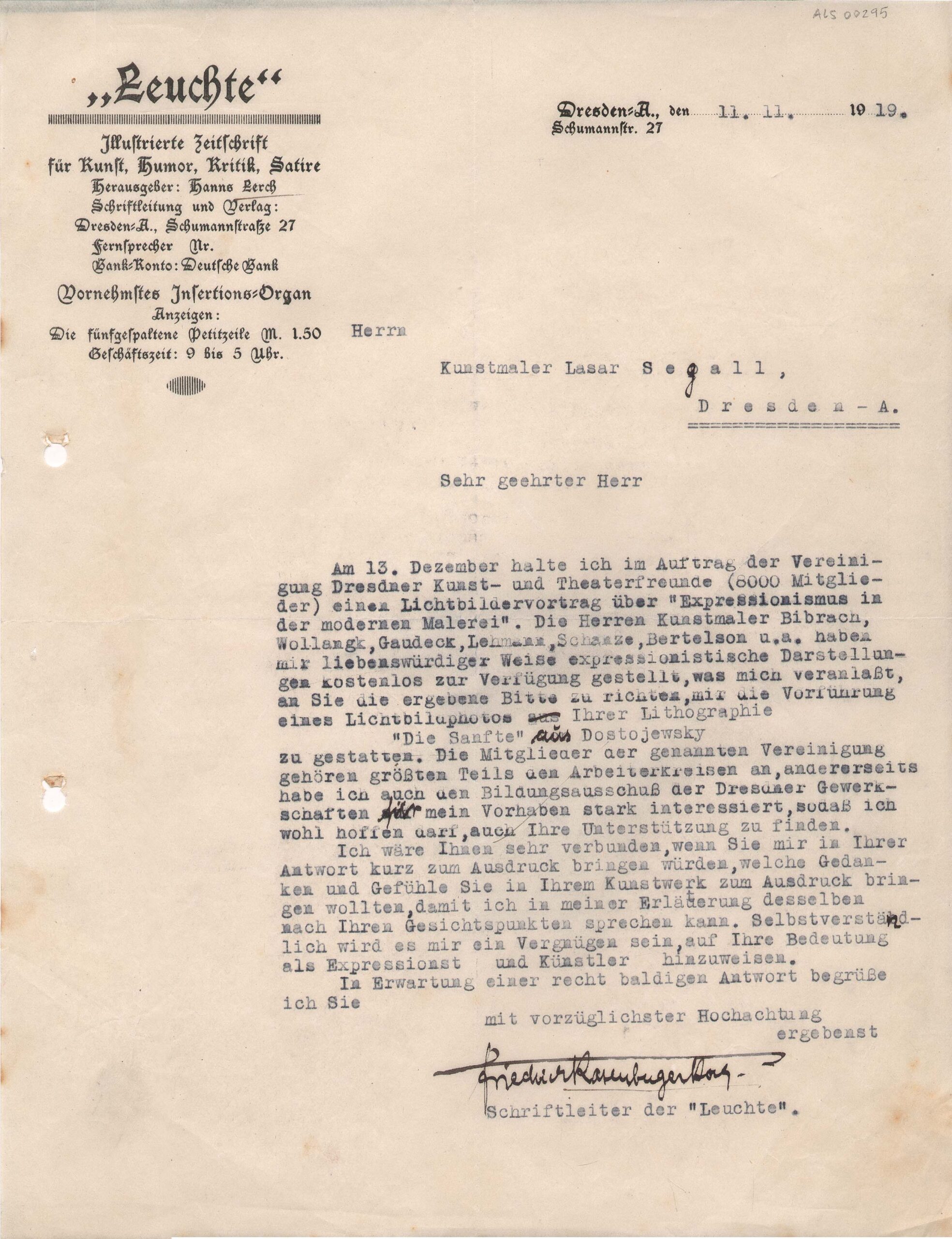 Papel timbrado: "Leuchte". Pequenas correções feitas a tinta preta / Item Relacionado: ALS 00294