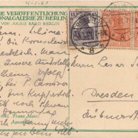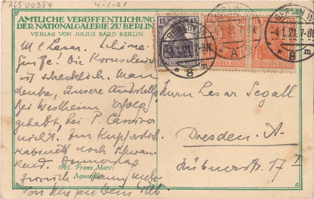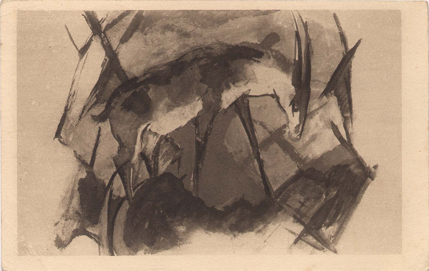 Cartão postal da "Amtliche Veröffentlichung der Nationalgalerie zu Berlin"; na frente, reprodução de aquarela de Franz Marc