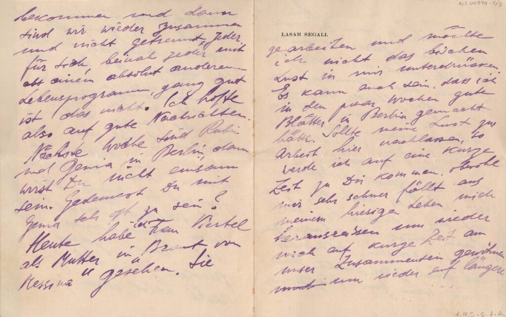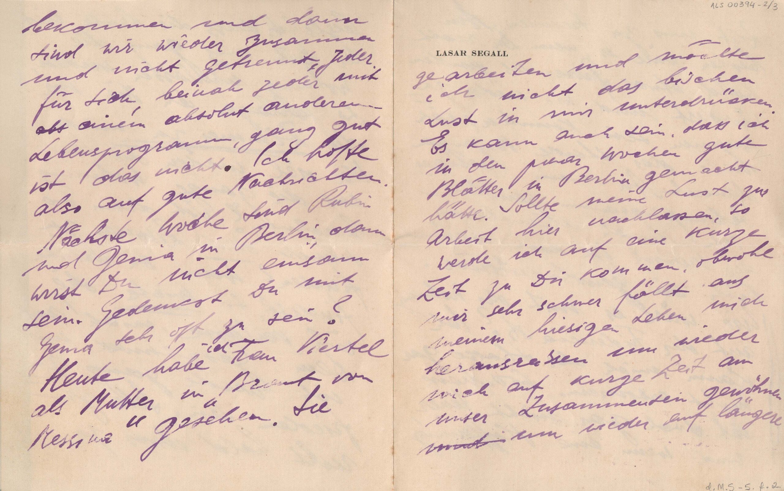 Papel timbrado:"Lasar Segall"; Acompanha envelope ALS 00394-E, postado em 28-1-1921; endereço do remetente: L.Segall, Dresden - A, Hübnerstrasse 19; verificar, quando da tradução se a seqüência das páginas está correta