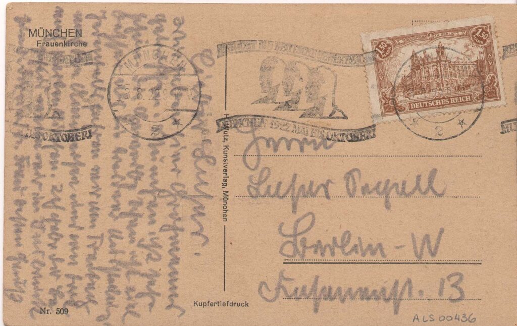 Na frente, fotografia da igreja Frauenkirche, de Munique, por H. Wutz, Kunstverlag, München; no verso, havia a grafite o nº 434 da listagem da exposição "Signos de uma vida"