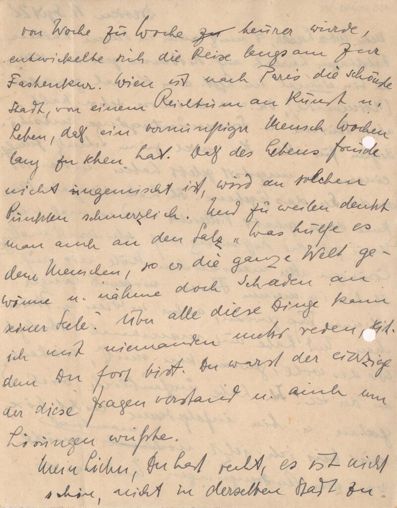 Diz que esteve na Normandia; conta de viagens a Viena e Munique, diz que viu muita coisa; fala que comprou 2 álbuns de Segall, através de von Garvens