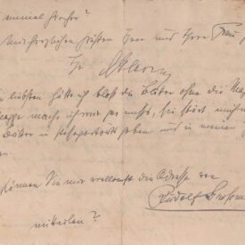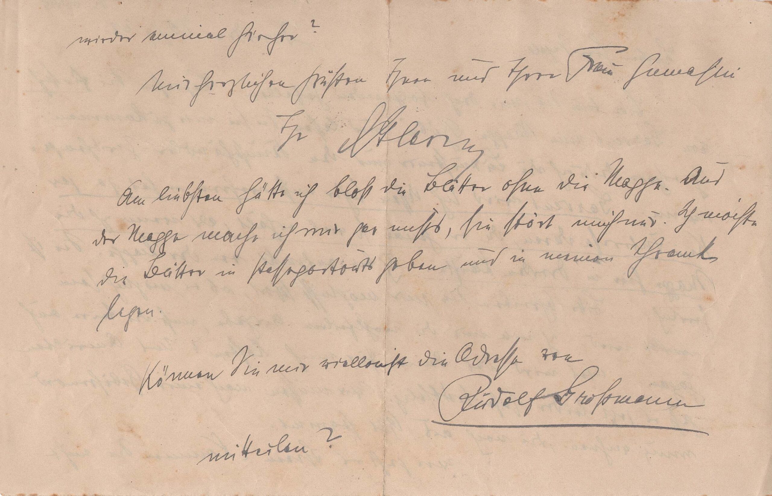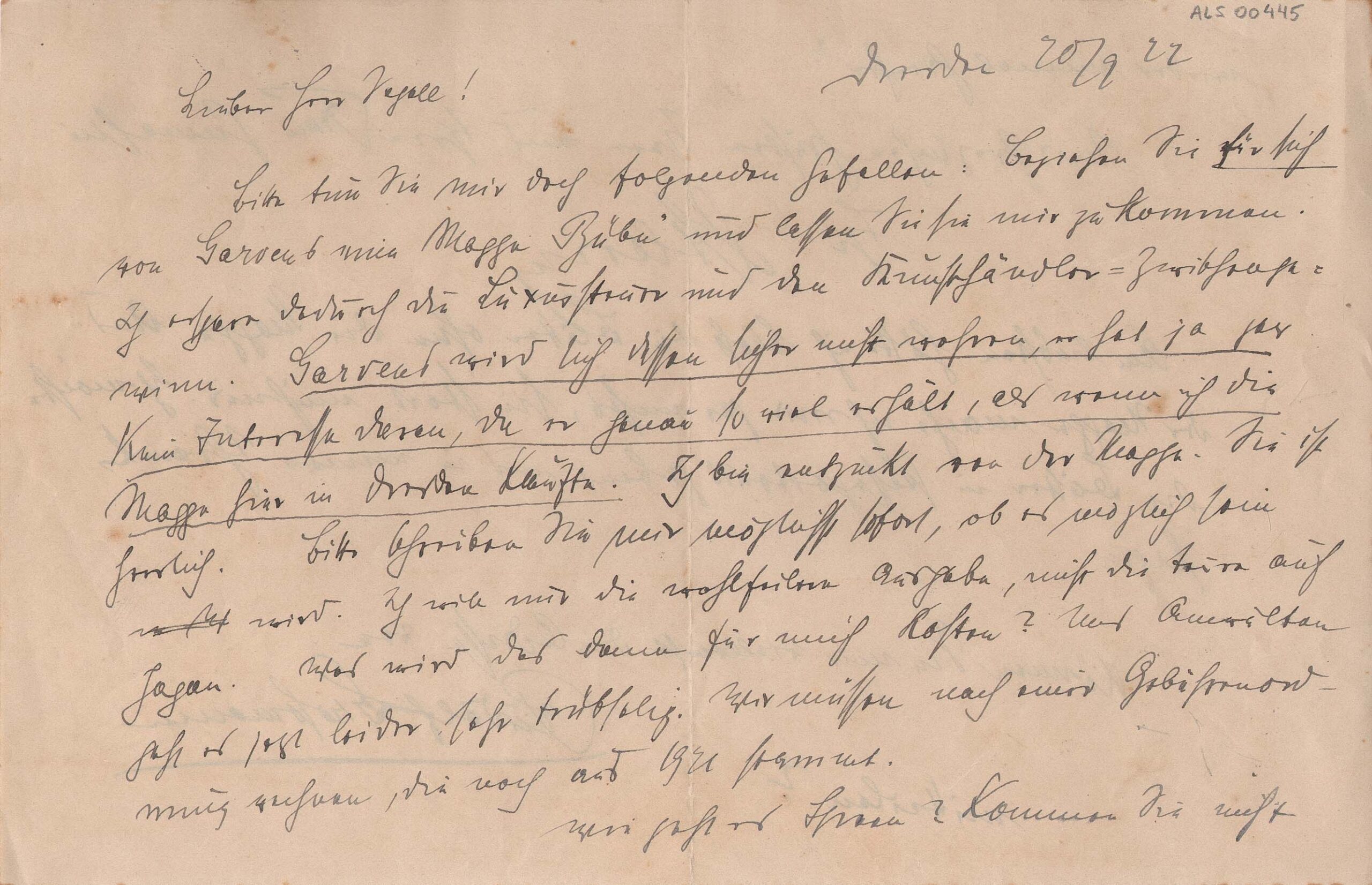 Autor: Anton Glasny o mesmo dos docs ALS 00405 e 407, de 1921, de Dresden; Post Scriptum por Rudolf Grossmann . No verso, havia o nº 326 da listagem da exposição Signos de uma vida / Item Relacionado: Do mesmo autor: ALS 00405 e ALS 00407