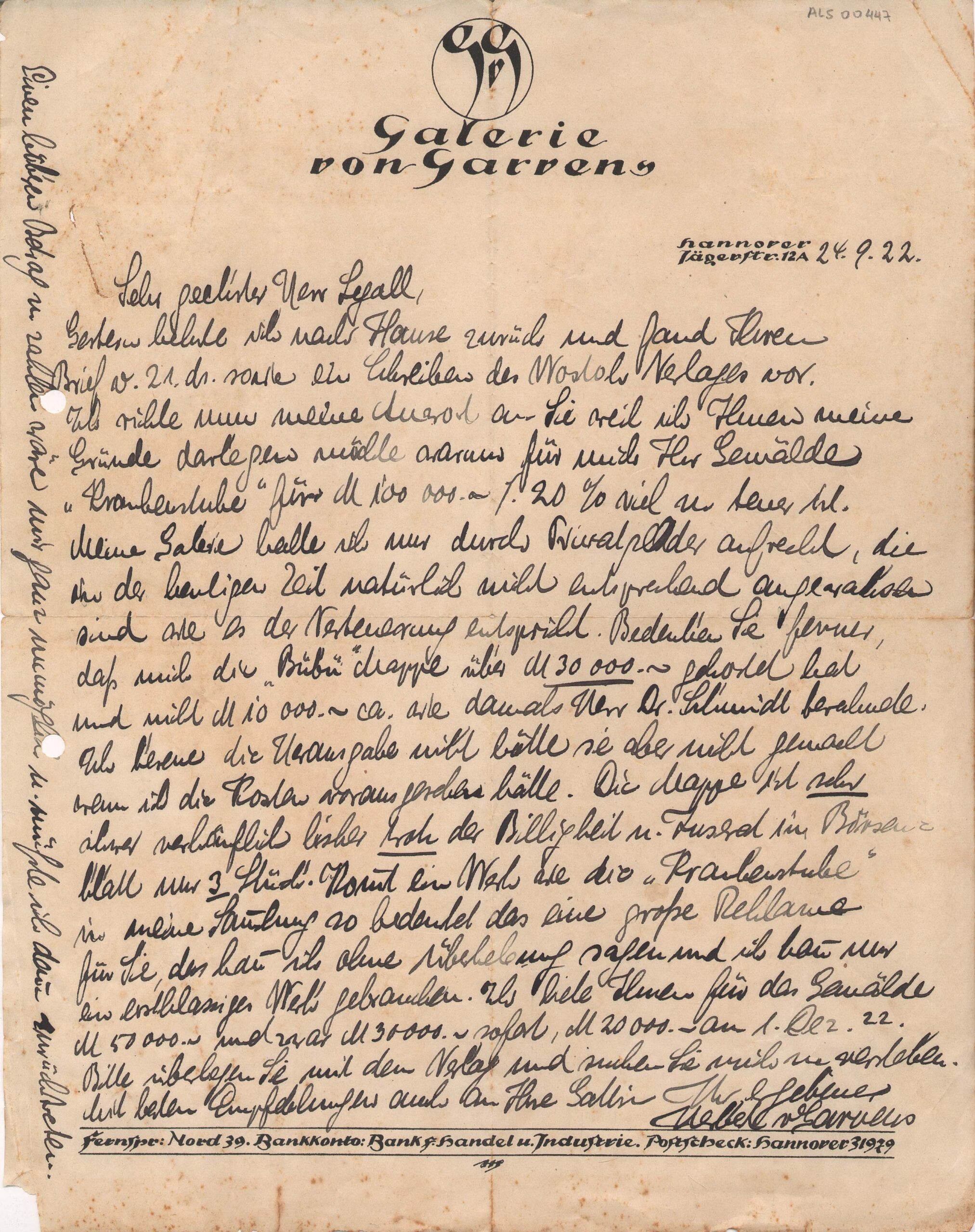 Papel timbrado: "Galerie von Garvens". No verso, havia o nº 416 da listagem da exposição Signos de uma vida / Item Relacionado: Recíproca: ALS 00450