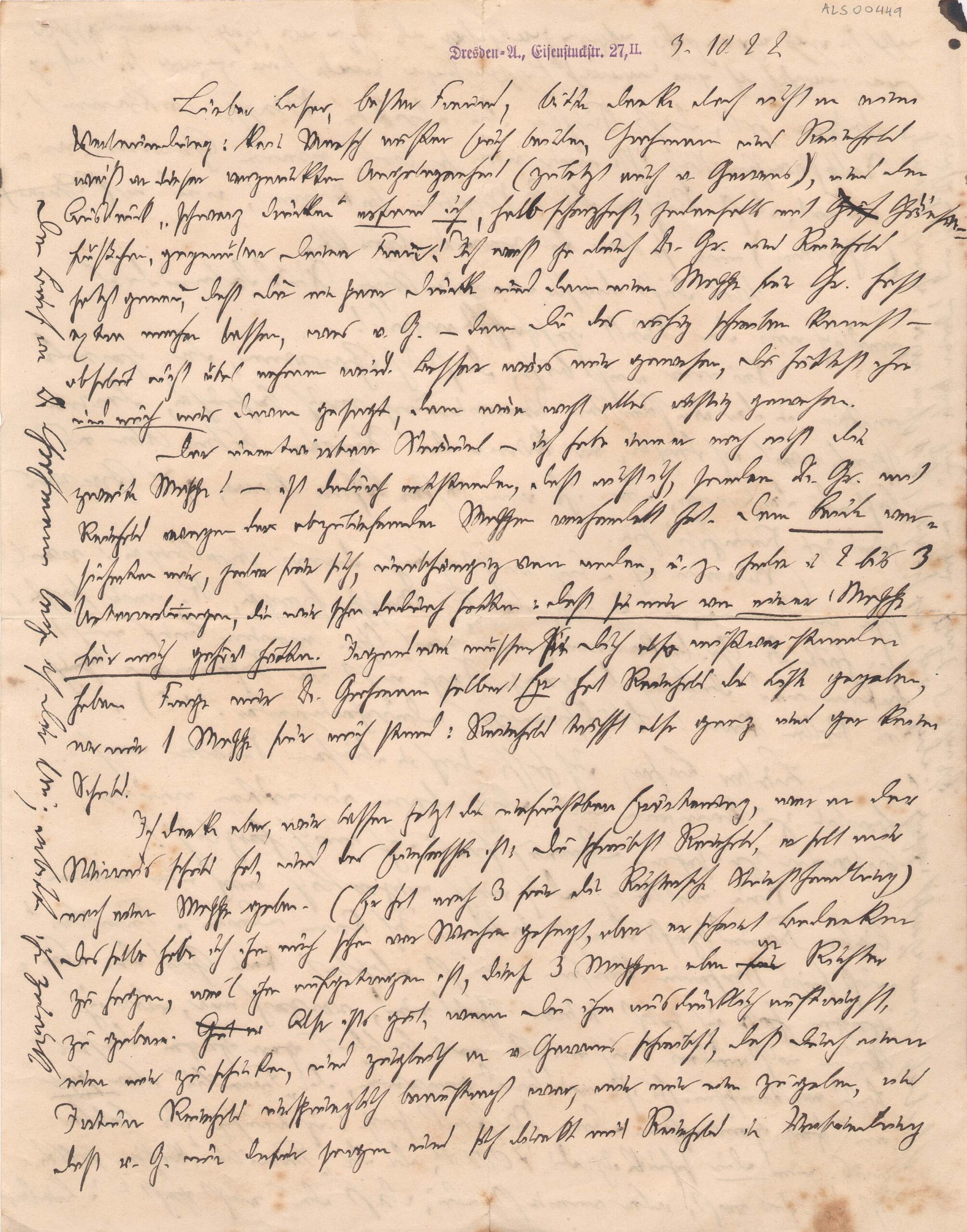 No centro superior, carimbo: "Dresden - U, Eisenstudstr. 27, II"; na primeira página, grifos a tinta preta feitos, provavelmente, pelo autor