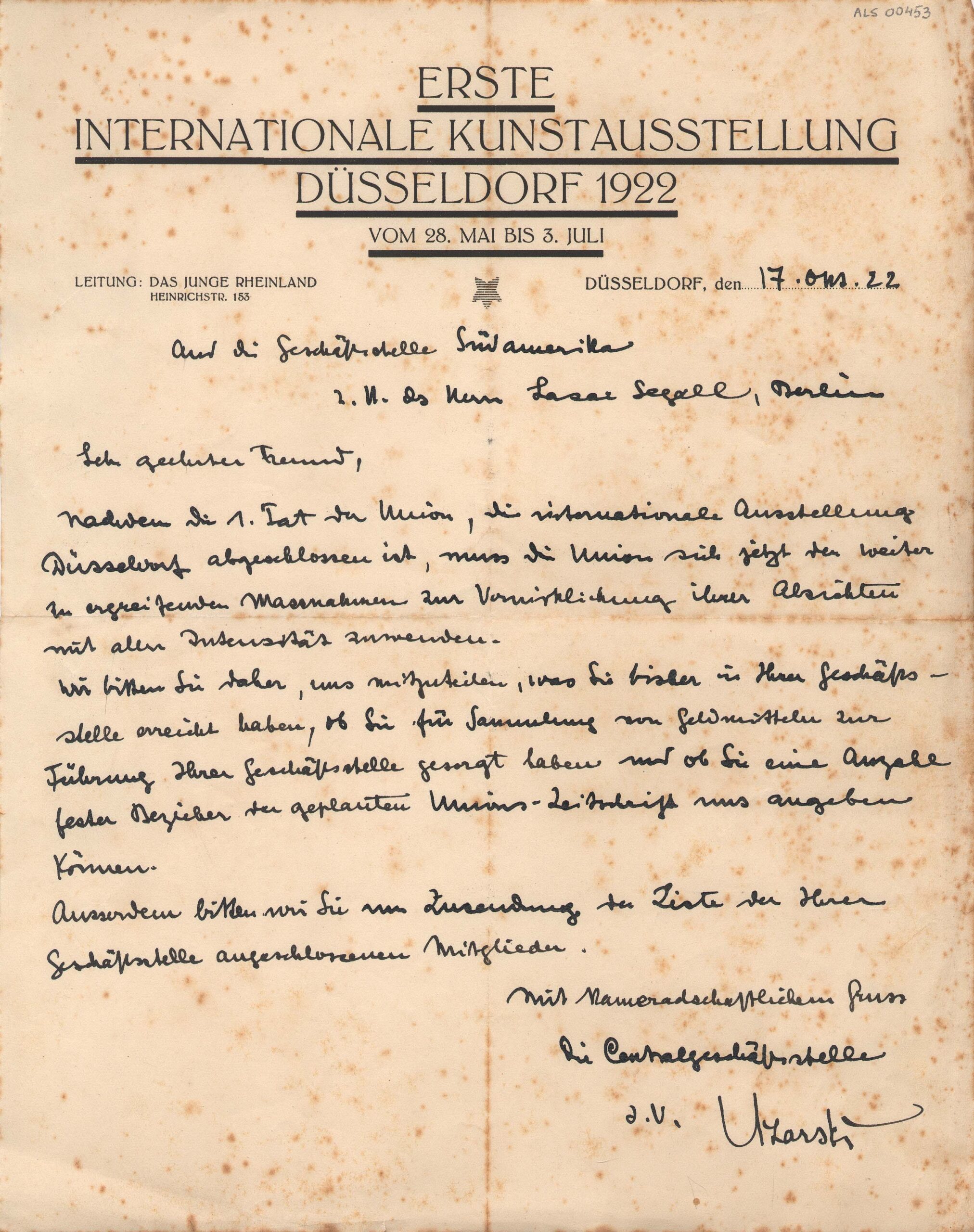 Adolf Uzarski, organizador da Erste Internationale Kunstausstellung Düsseldorf [Primeira exposição internacional de Düsseldorf], de 1922, solicita informações de Lasar Segall a respeito dos negócios da seção berlinense da União, administrados por Segall.