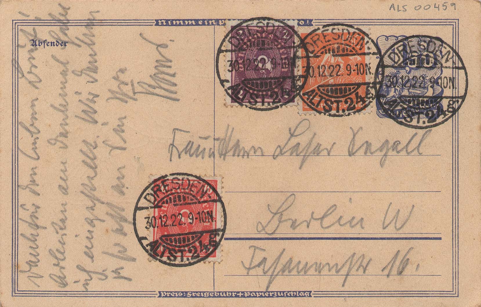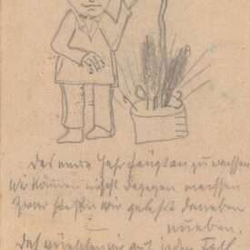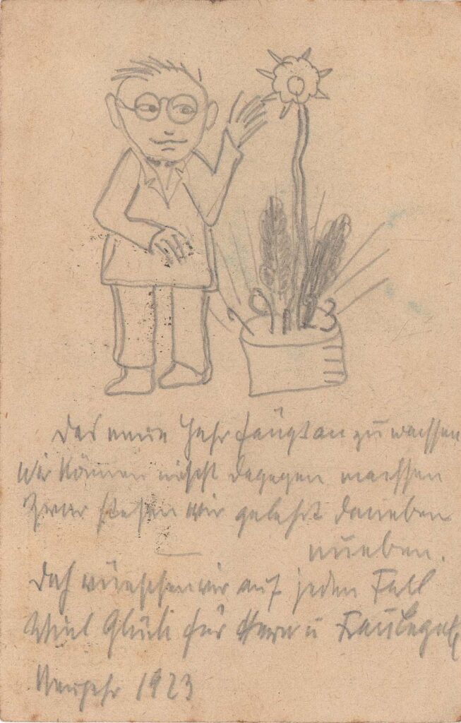 No verso, desenho a grafite, provavelmente feito pelo autor, mostra um homem ao lado de um vaso de plantas representando o ano novo de 1923