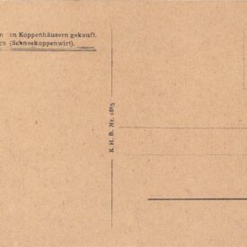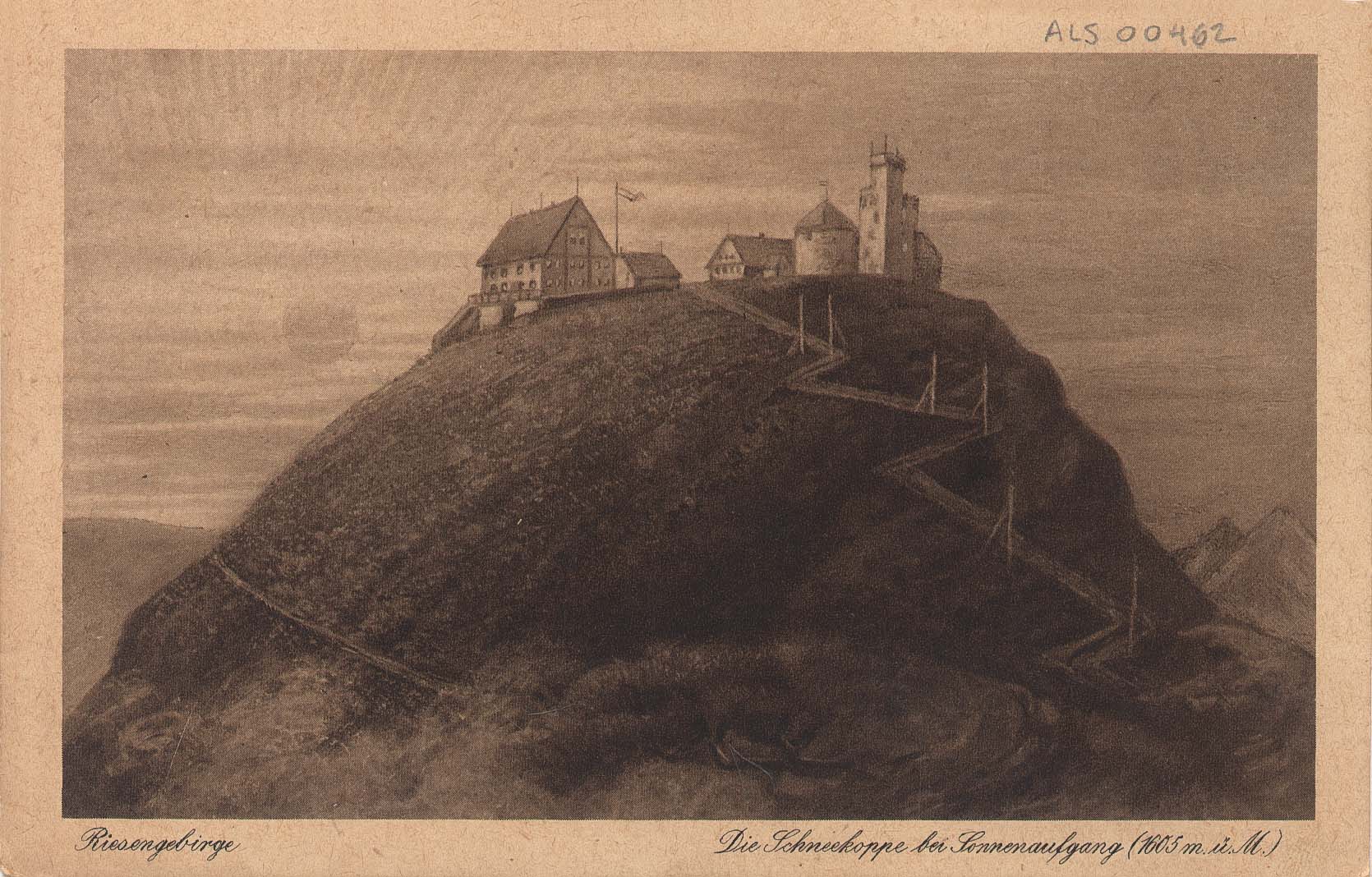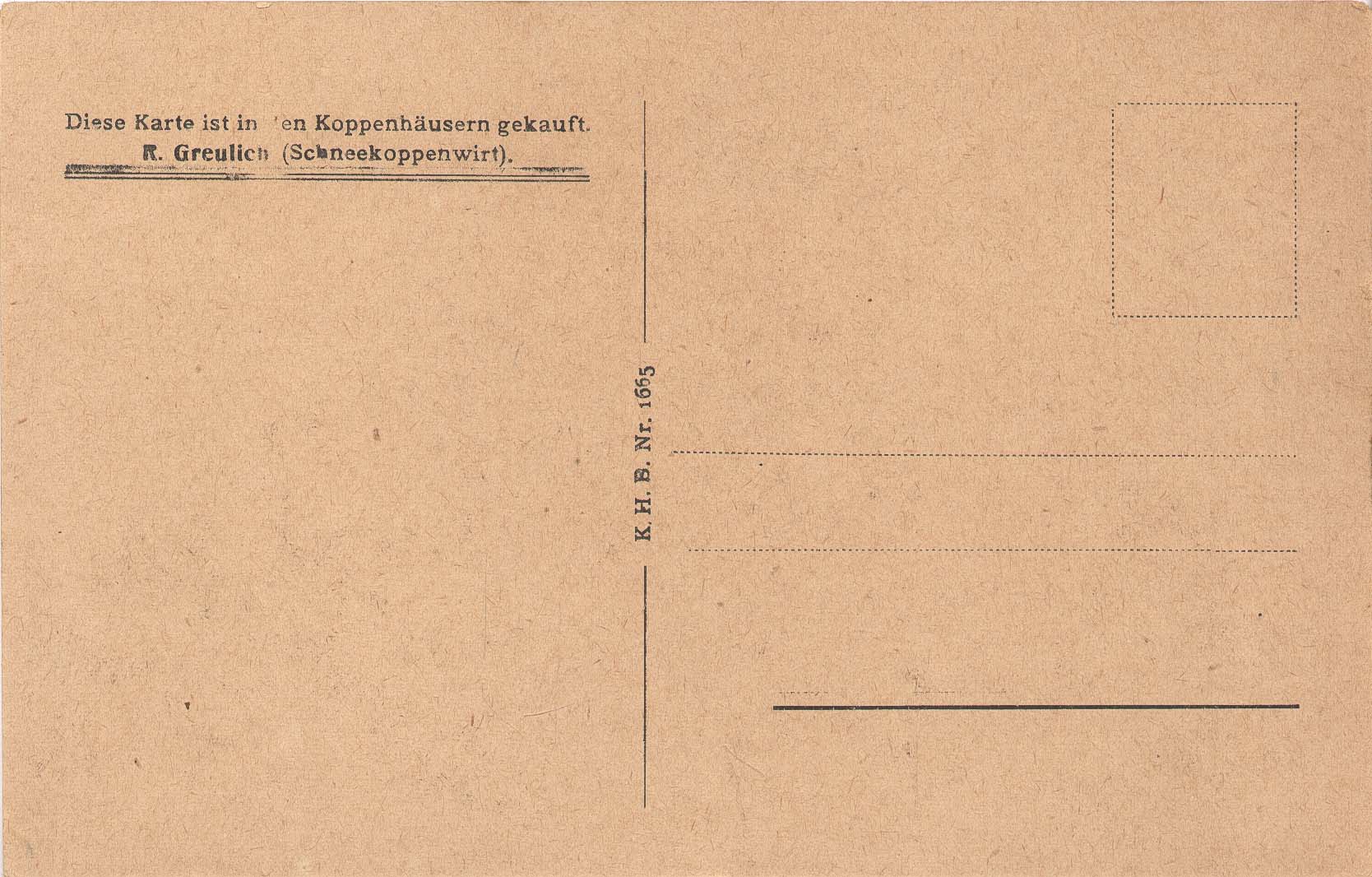 Cartão postal em branco; na frente, impresso: "Riesengebirge. Die Schneekoppe bei Sonnenaufgang (1605 m. ü. M.); no verso, impresso: "Diese Karte ist in den Koppenhäusern gekauft. R. Greulich (Schneekoppenwirt). K. H. B. Nr. 1665"