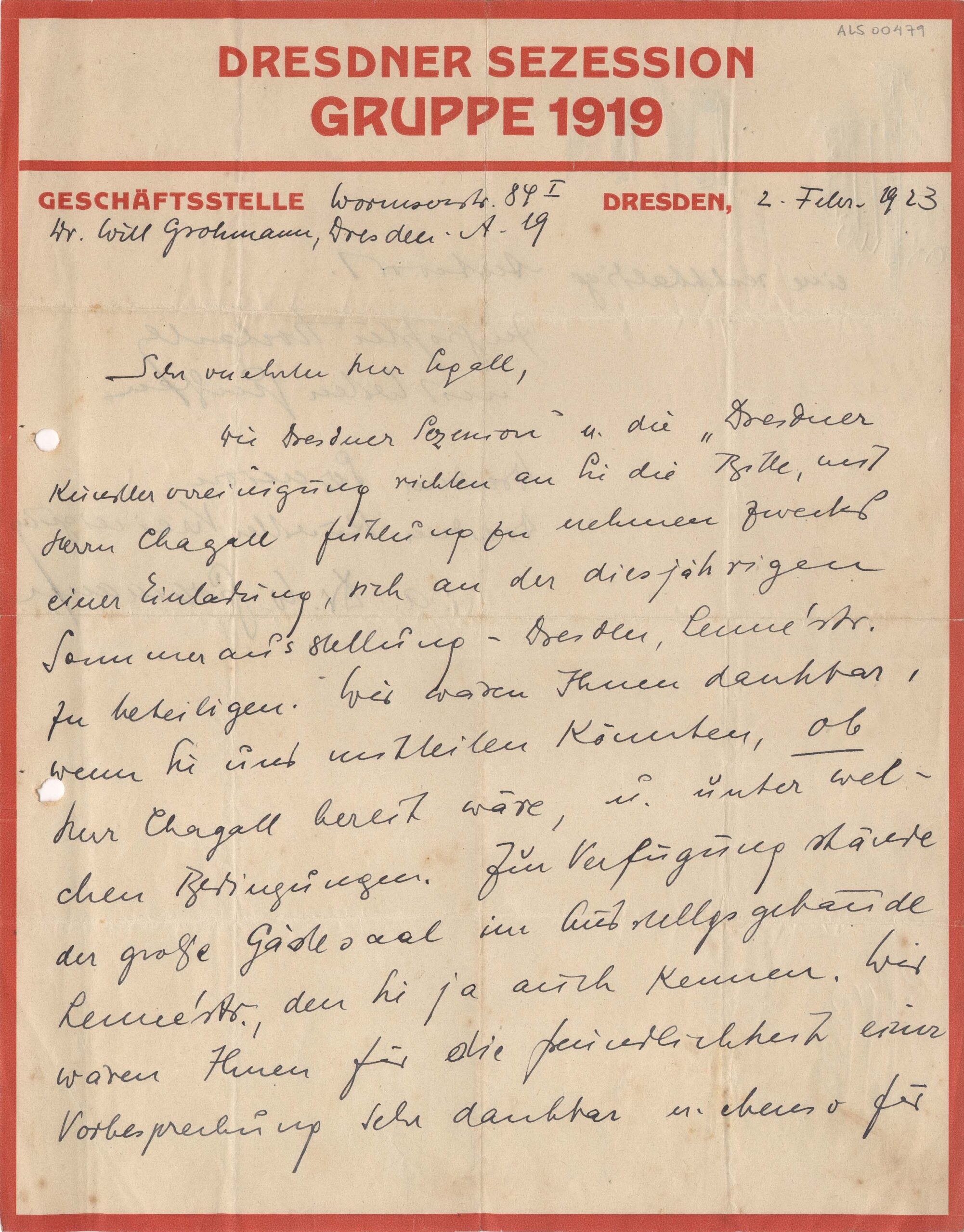 Will Grohmann pede, em nome da Dresdner Sezession Gruppe 1919 e da Dresdner Kunstlervereinigung, a Segall que entre em contato com Marc Chagall