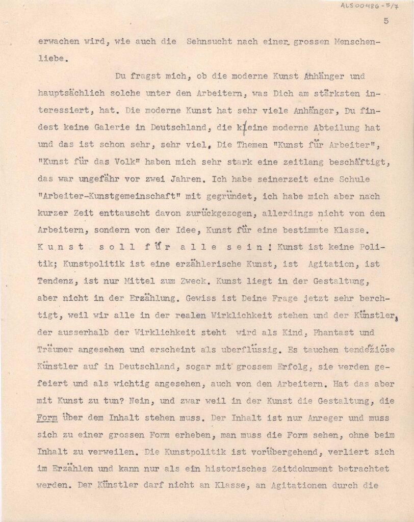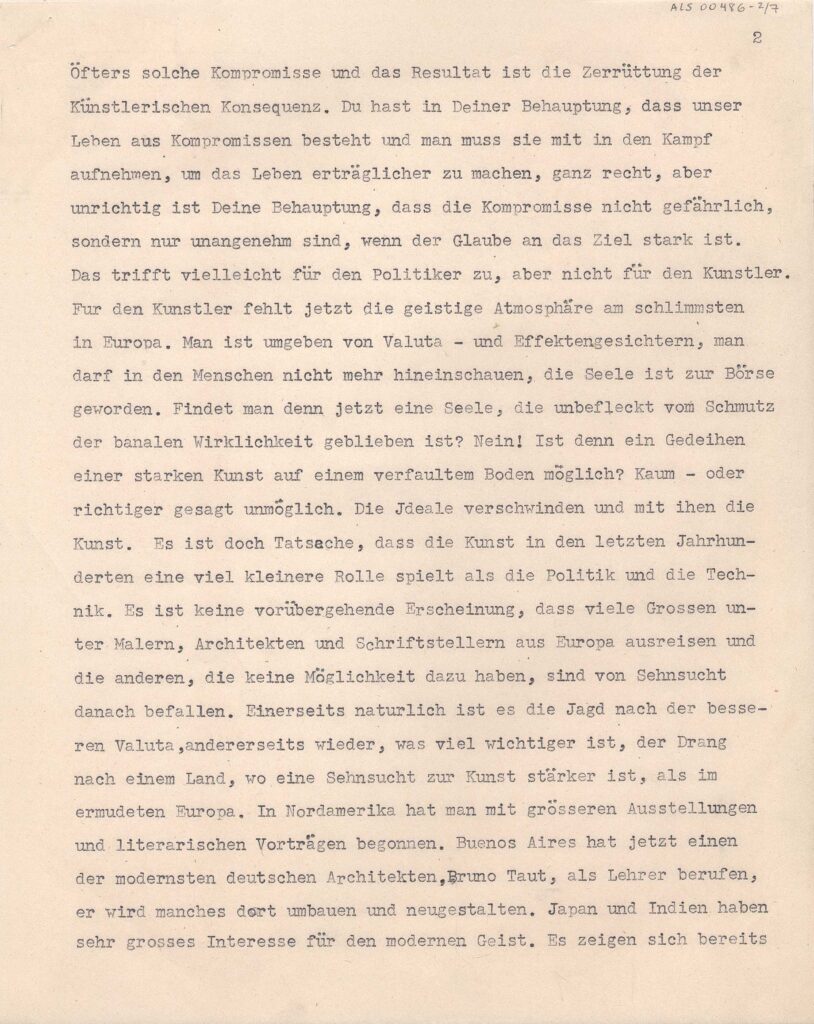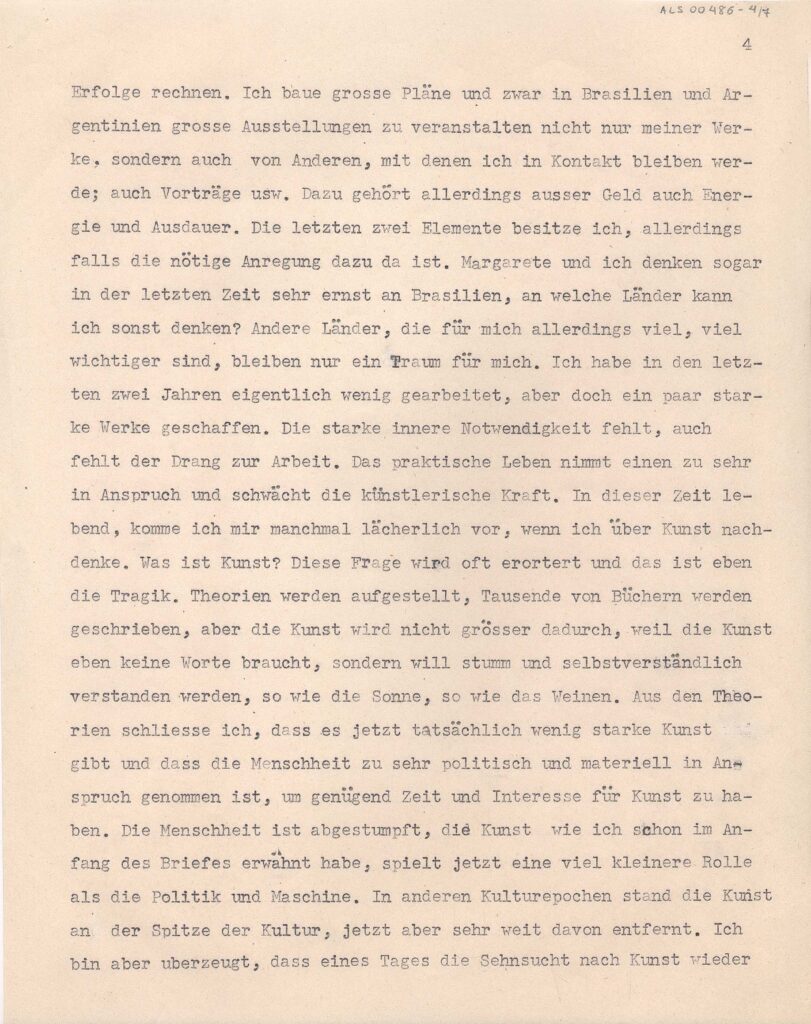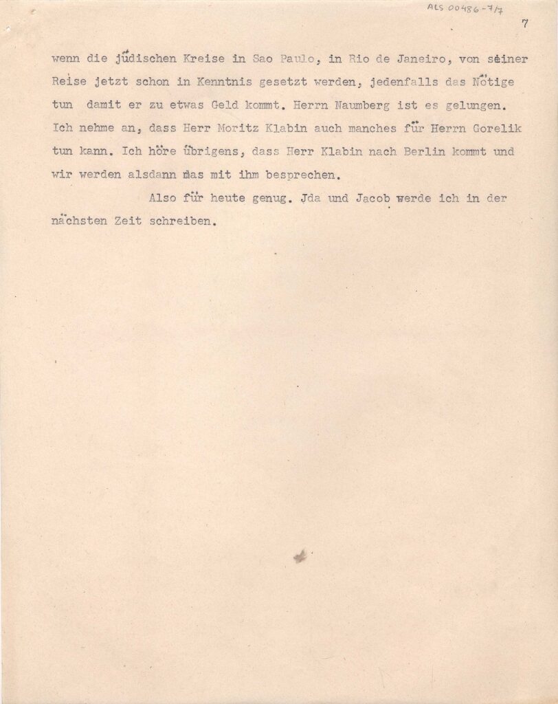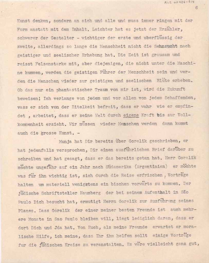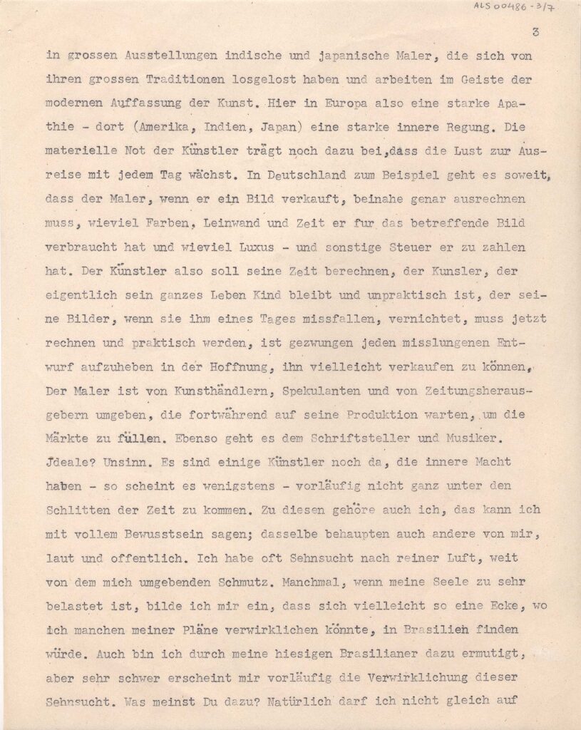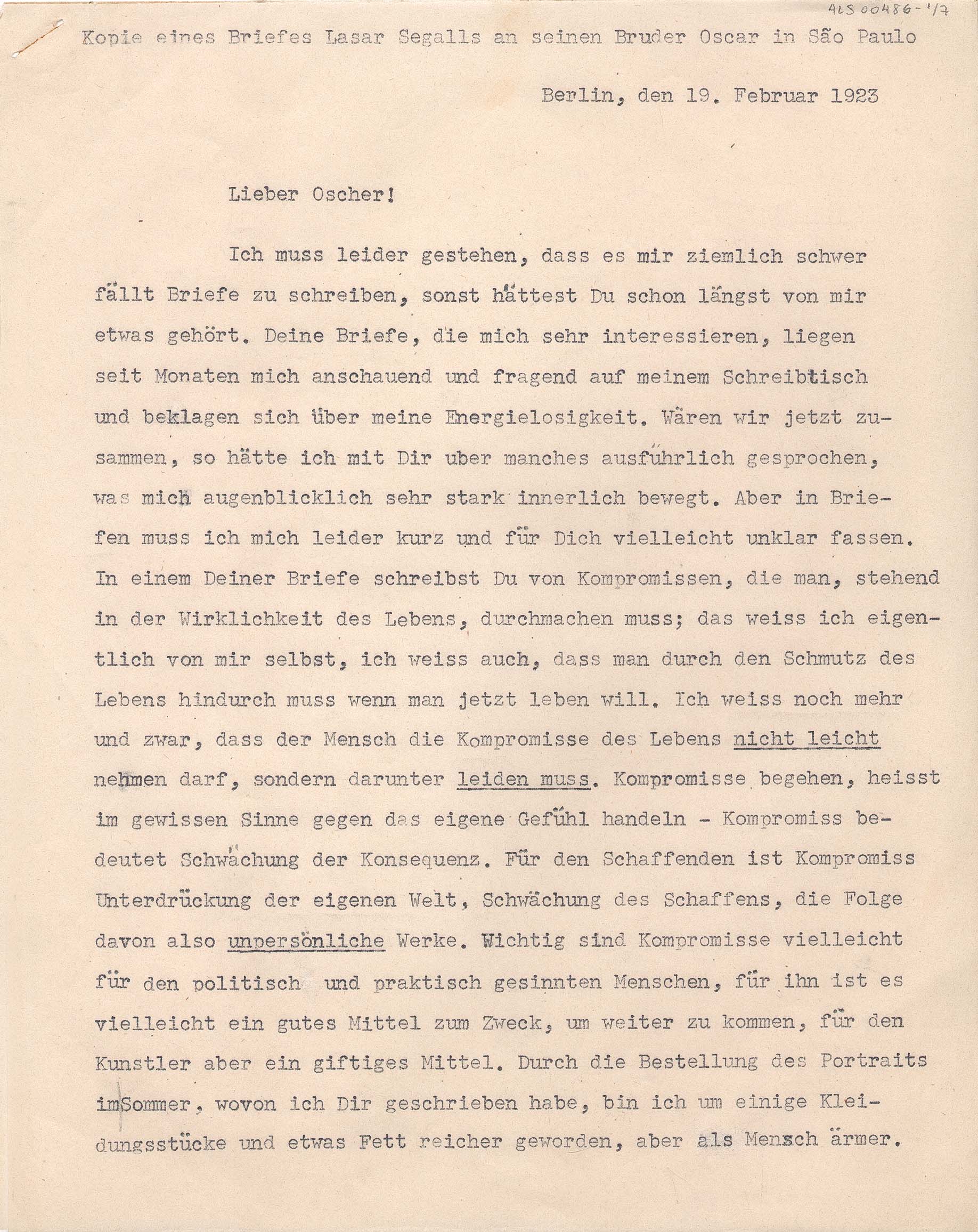 Cópia carbono repetida quatro vezes; Anotação: Kopie eines Briefes Lasar Segall an seinen Bruder Oscar in São Paulo. Cópia xerox: Reserva Técnica, Armário de aço, Gaveta 1, Pasta 1921-1924 / Item Relacionado: ALS 00485, ALS 00487 e ALS 00488