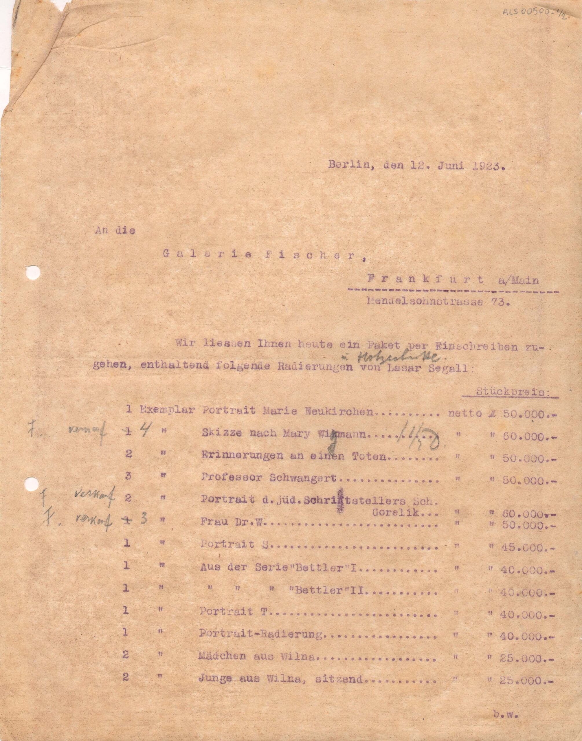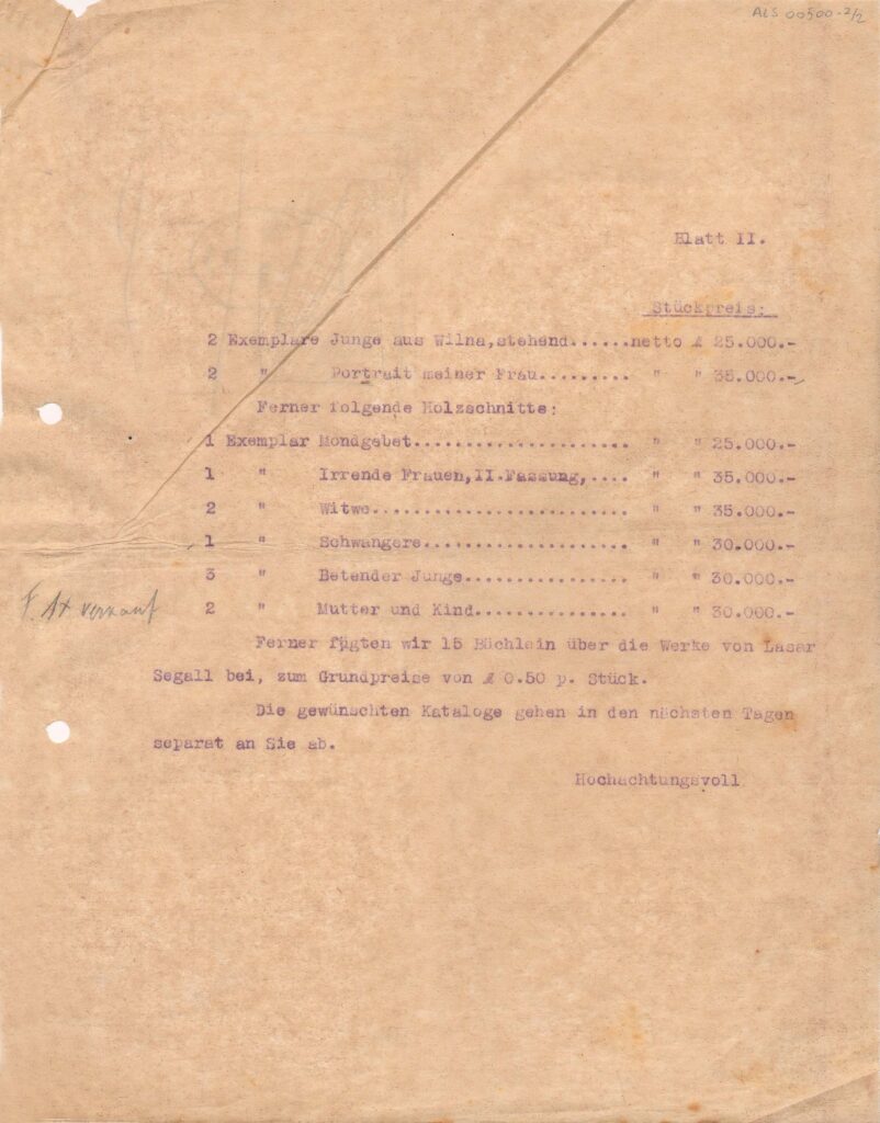Segall informa que preparou, para a Galerie Fischer, um pacote com águas-fortes e xilogravuras suas; lista as gravuras e seus respectivos preços de venda