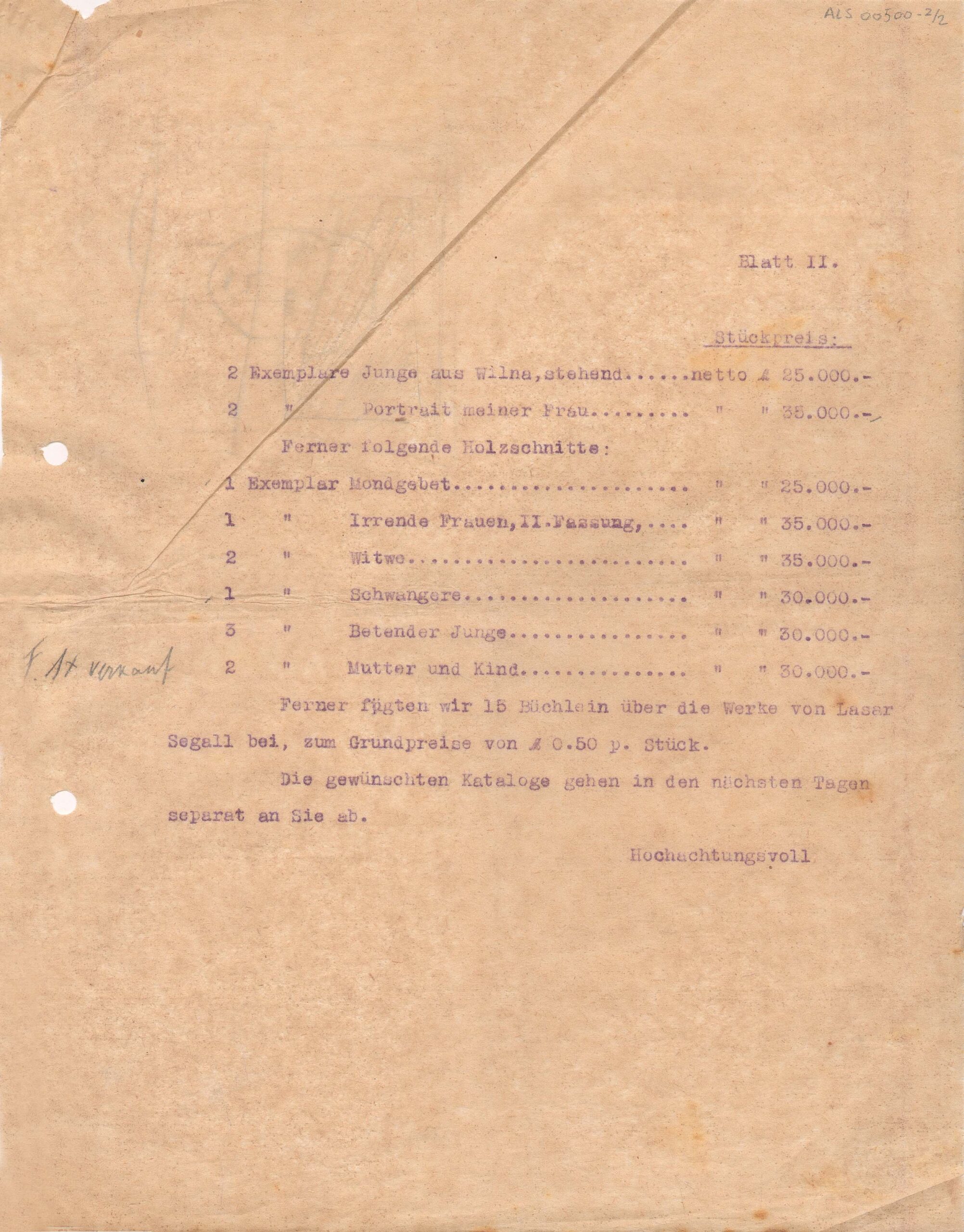 Anotações a grafite, por Lasar Segall, indicando obras vendidas