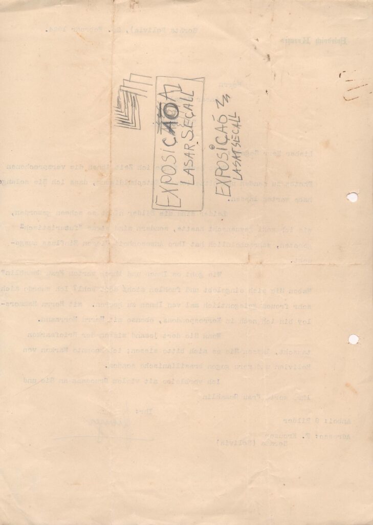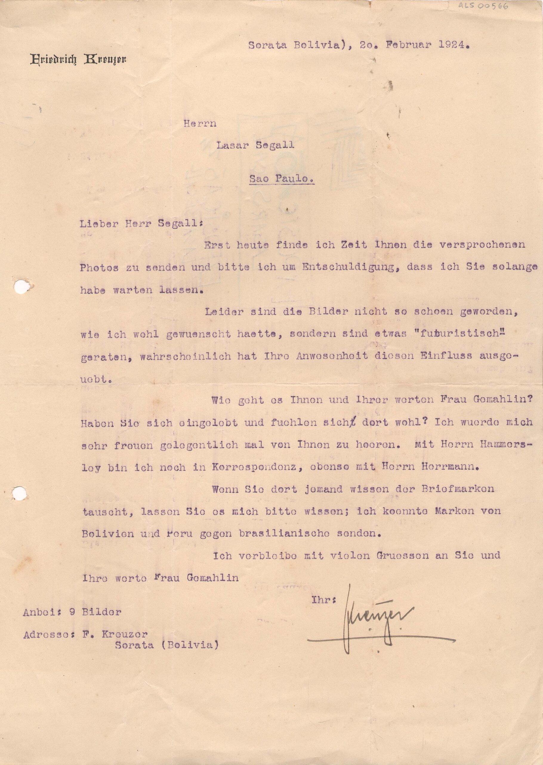 Diz que encontrou as fotos mencionadas e se desculpa pelo tempo decorrido; os quadros [imagens] não ficaram tão bonitos, como ele desejaria, mas um pouco "futuristas"; pergunta como vai Segall e sua esposa e informa que tem trocado correspondência com os srs. Hammersloy e Herrmann; consulta Segall sobre o desejo de trocar selos postais, dizendo que pode mandar selos da Bolívia e Peru para o Brasil; anexa 9 quadros [fotografias
