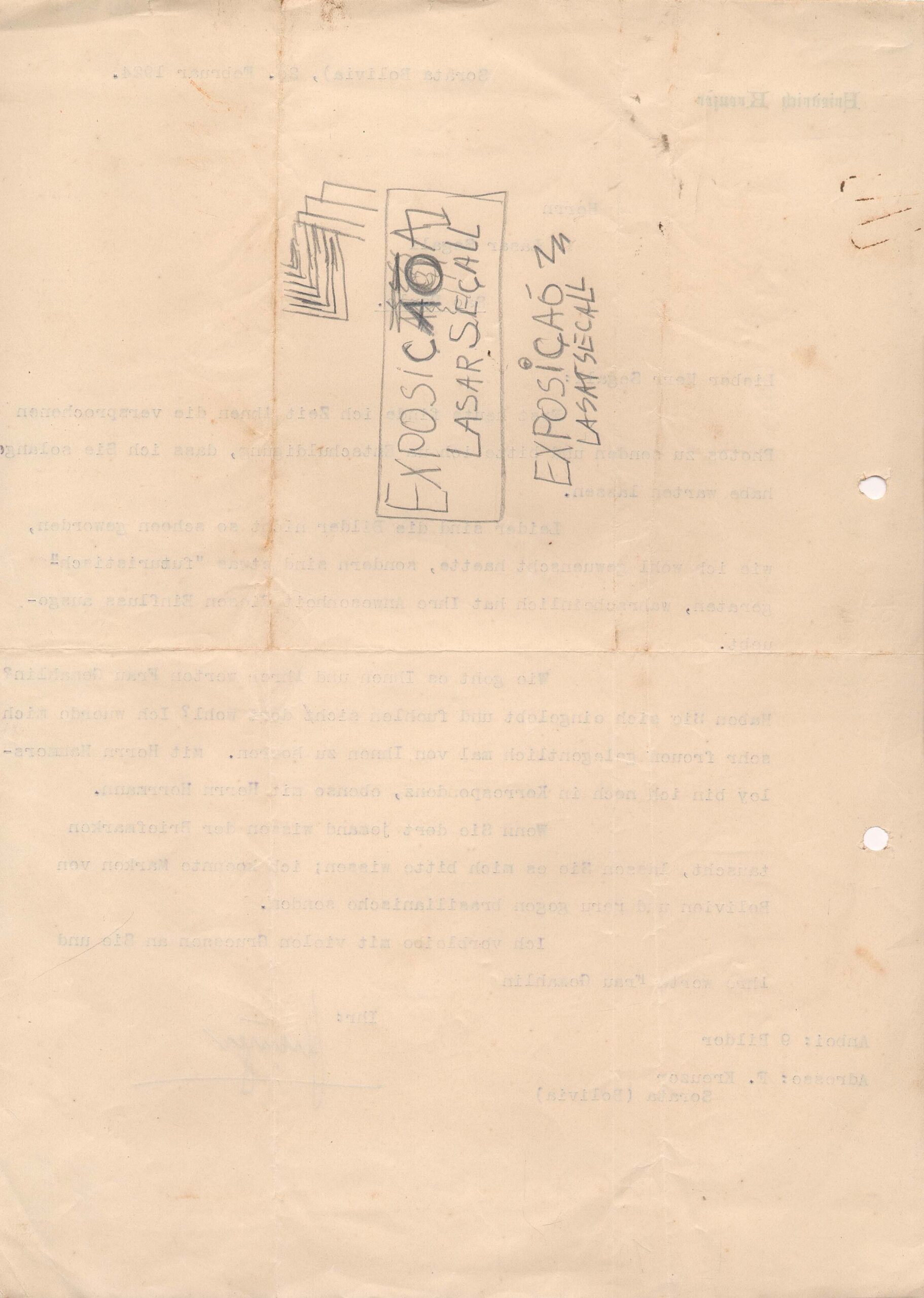 Diz que encontrou as fotos mencionadas e se desculpa pelo tempo decorrido; os quadros [imagens] não ficaram tão bonitos, como ele desejaria, mas um pouco "futuristas"; pergunta como vai Segall e sua esposa e informa que tem trocado correspondência com os srs. Hammersloy e Herrmann; consulta Segall sobre o desejo de trocar selos postais, dizendo que pode mandar selos da Bolívia e Peru para o Brasil; anexa 9 quadros [fotografias