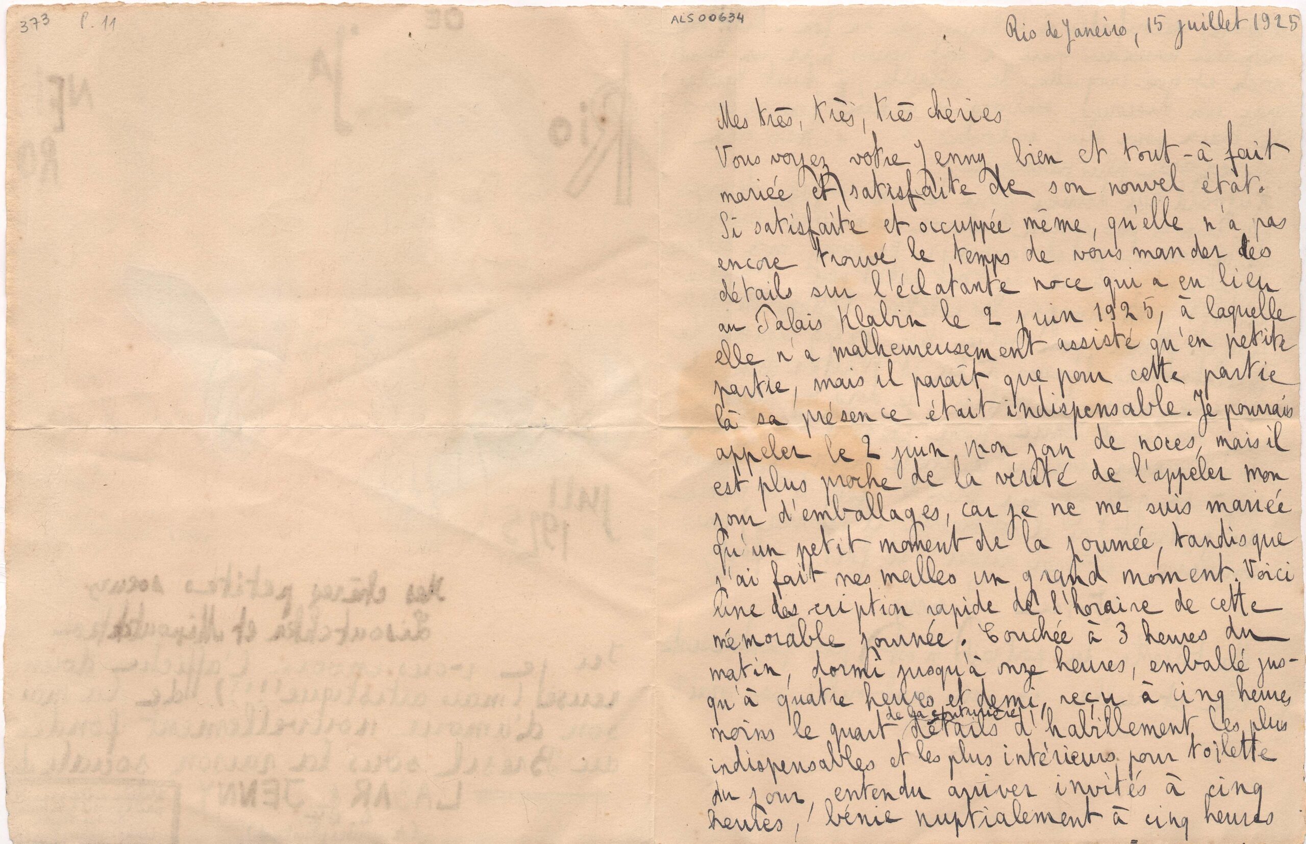 Narrativa de Jenny Klabin Segall, às duas irmãs Mina e Luiza, das providências tomadas para seu casamento, ocorrido em 2 de junho de 1925, e notícias da viagem de trem e da lua-de-mel no Rio de Janeiro, às vésperas do retorno a São Paulo