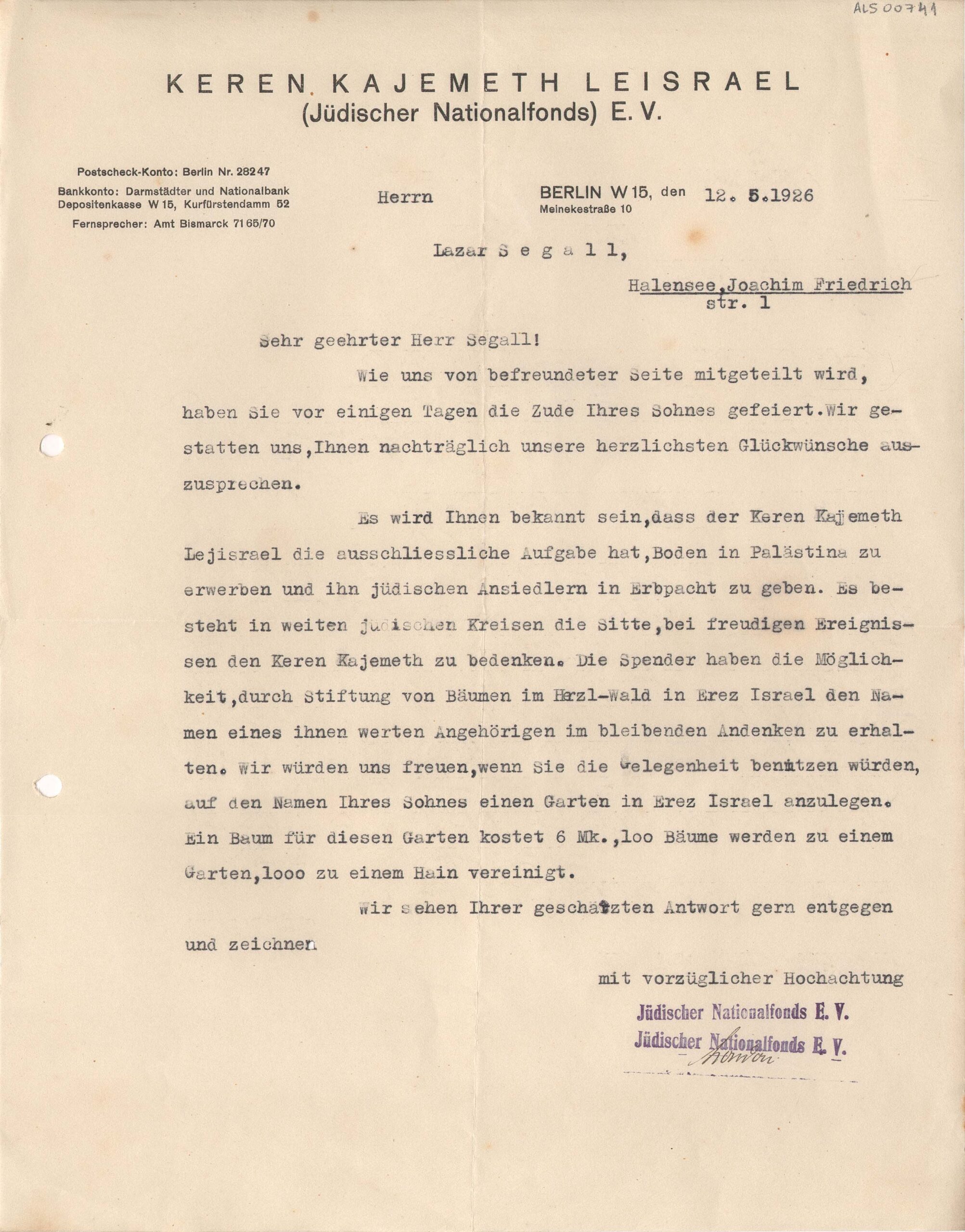 A sociedade Keren Kajemeth Leisrael declara que tem a tarefa exclusiva de adquirir terras na Palestina e entregá-las a colonos judeus, em contratos de longa duração; diz ainda que os doadores têm a opção de patrocinar a aquisição de árvores, dando a elas o nome de parentes, como uma homenagem duradoura; sabedores do recente nascimento do filho de Segall, sugerem que Segall participe com a aquisição de árvores - 6 marcos cada uma - para formar um jardim (100 árvores) ou um bosque (1.000 árvores), oportunidade de colocar o nome do filho em Eretz Israel