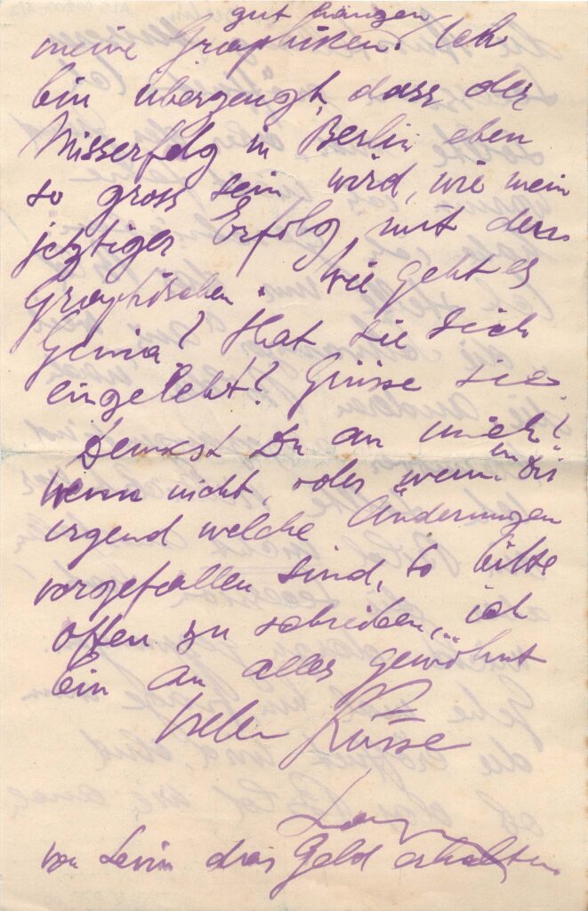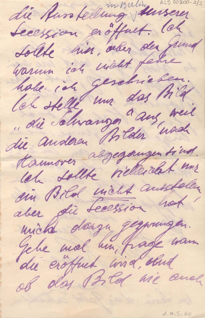 Refere-se à distância entre eles e a questões pessoais e financeiras; informa que irá expor apenas a obra "A Gestante" na exposição da Secessão que abriria em breve em Berlim, além de algumas gravuras não especificadas; as outras obras, informa, estavam a caminho de Hannover; pede a Margarete que examine o local da exposição, em Berlim, para se certificar de que suas obras estão bem colocadas.