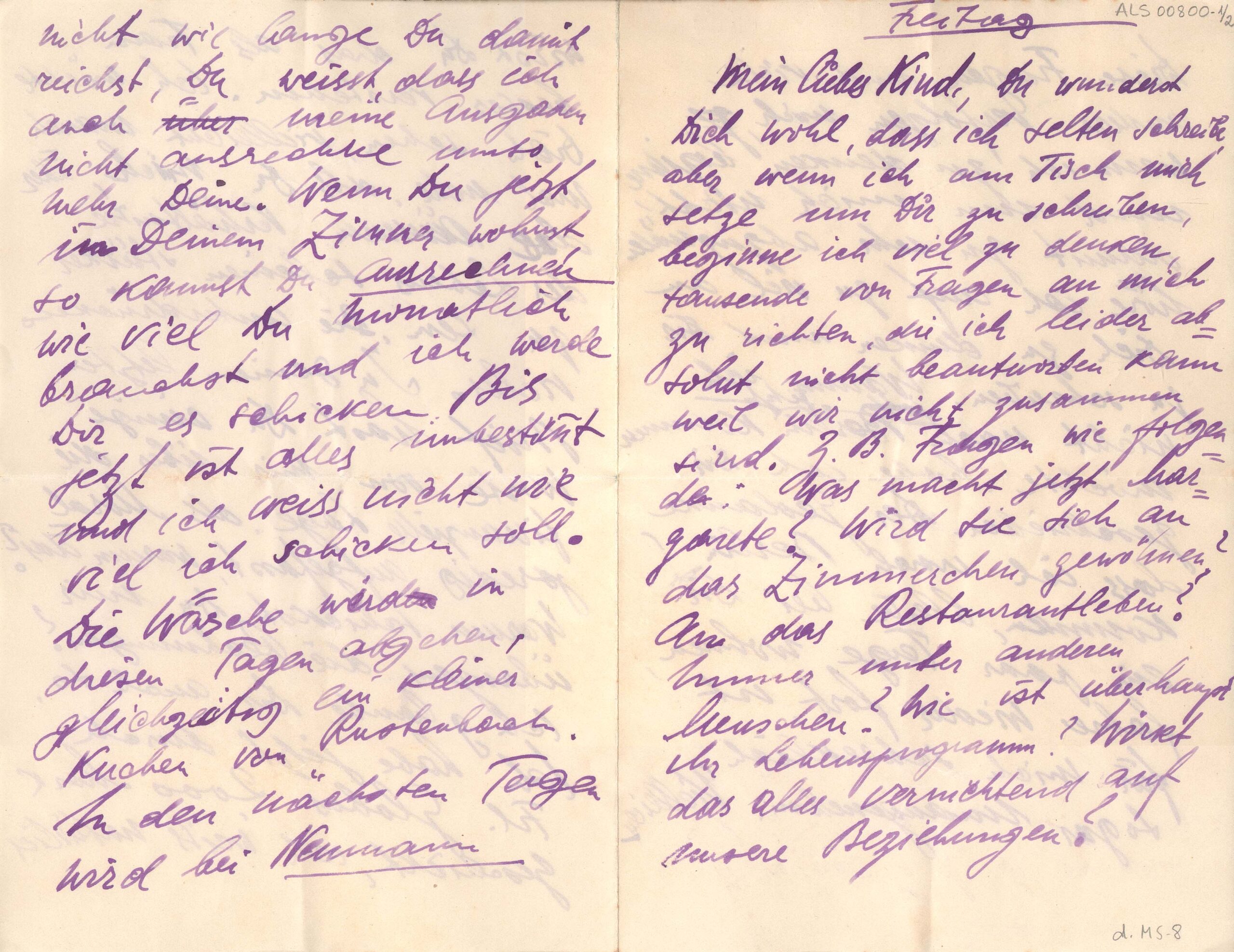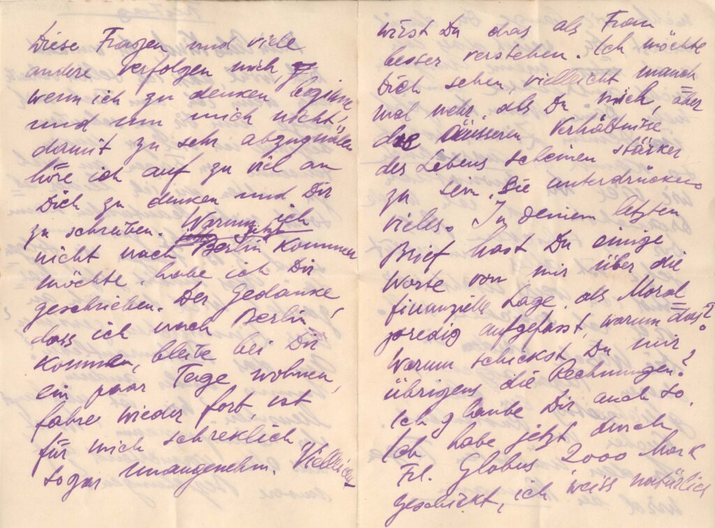 Carta sem data, indicado "Freitag" [sexta-feira]; acompanha envelope ALS 00800-E, postado em 3-2-1921; Segall em Dresden, Hübnerstr, 19; Margarete em Berlin - W, Kurfürstendamm, 29, Gartenhaus, bei Frau Preger; doação Margarete Suhr, d.MS - 8 e 60