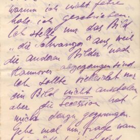 Refere-se à distância entre eles e a questões pessoais e financeiras; informa que irá expor apenas a obra "A Gestante" na exposição da Secessão que abriria em breve em Berlim, além de algumas gravuras não especificadas; as outras obras, informa, estavam a caminho de Hannover; pede a Margarete que examine o local da exposição, em Berlim, para se certificar de que suas obras estão bem colocadas.